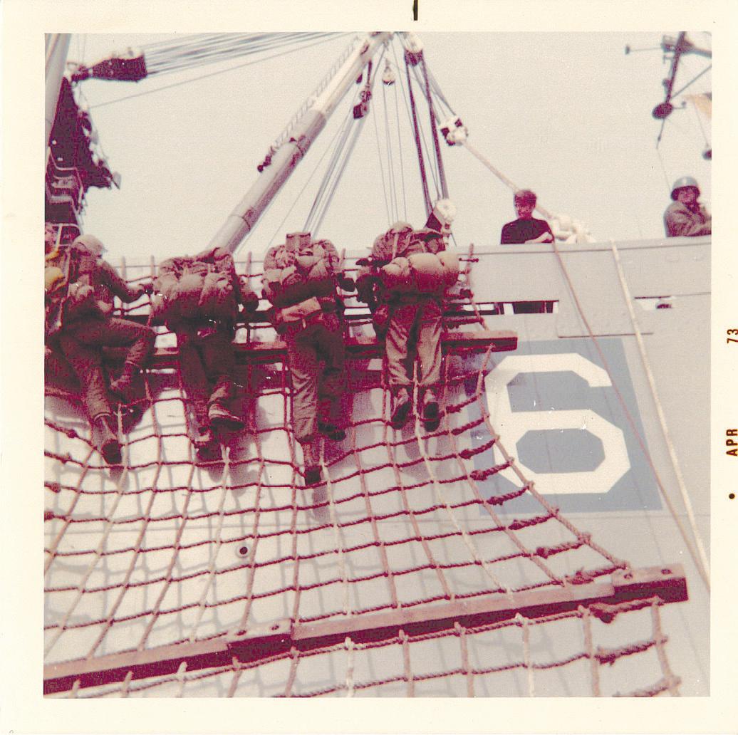 Eventually, off we went. After days on the ship, we arrived in South Korea where we practiced beach landings and set up equipment. Then we did more extreme maneuvers for like 30 days—stuff like repelling out of a helicopter, reading a compass, mountain climbing, pulling yourself across a river and running over terrain to get to whatever coordinates they gave us. They showed us about the deadly snakes and how to survive in the jungle—all the Rambo stuff.