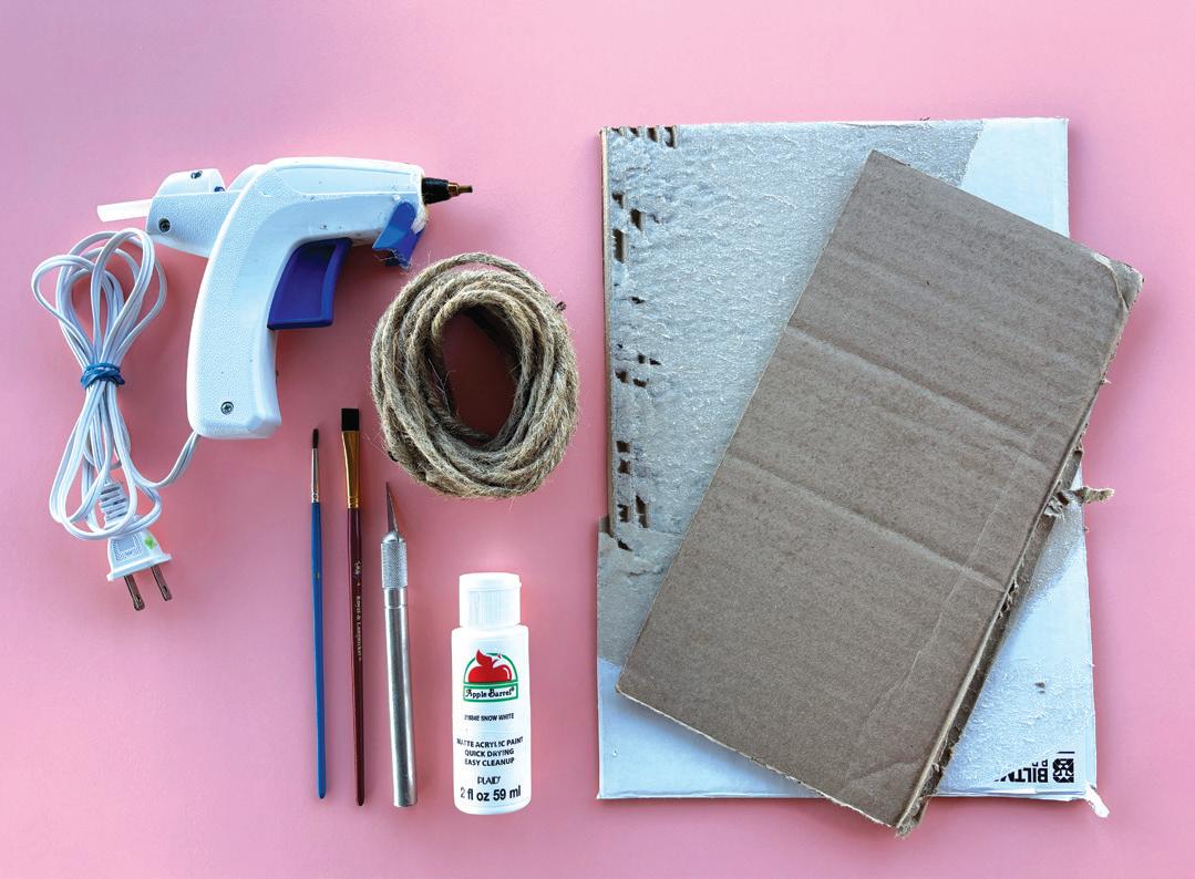 Step one: Gather your supplies: Hot glue gun, cardboard, paint, brushes and scissors.