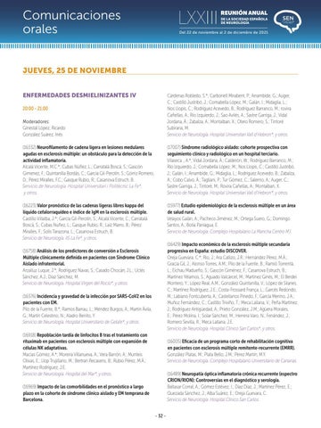 (16758) Análisis de los predictores de conversión a Esclerosis Múltiple clínicamente definida en pacientes con Síndrome Clínico Aislado infratentorial. Arzalluz Luque, J.*; Rodríguez Navas, S.; Casado Chocán, J.L.; Uclés Sánchez, A.J.; Díaz Sánchez, M. Servicio de Neurología. Hospital Virgen del Rocío*, y otros. (16376) Incidencia y gravedad de la infección por SARS-CoV2 en los pacientes con EM. Pilo de la Fuente, B.*; Ramos Barrau, L.; Méndez Burgos, A.; Martín Ávila, G.; Martín Celestino, N.; Aladro Benito, Y. Servicio de Neurología. Hospital Universitario de Getafe*, y otros. (16918) Repoblación tardía de linfocitos B tras el tratamiento con rituximab en pacientes con esclerosis múltiple con expansión de células NK adaptativas. Macias Gómez, A.*; Moreira Villanueva, A.; Vera Barrón, A.; Munteis Olivas, E.; Llop Trujillano, M.; Bertran Recasens, B.; Rubio Pérez, M.Á.; Martínez Rodríguez, J.E. Servicio de Neurología. Hospital del Mar*, y otros.