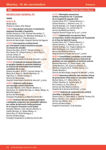 Pósters SERCOTEL SOROLLA PALACE 6H/7573 Meningitis neumocócica. Análisis retrospectivo de 11 pacientes de un hospital de segundo nivel Cuerda Clares, M.T.*; Gómez Moreno, I.; Gómez Romero, L.; Ramírez Luna, J.C.; Vicente Rodrigo, J.A.; Trapero Iglesias, N.; Nieto Rodriguez, J.A.; Carod Artal, F.J. Servicio de Medicina Interna. Hospital General Virgen de la Luz*, y otros 7H/7574 Rabdomiolisis tras ejercicio físico no traumática. Análisis retrospectivo de 15 pacientes en el Área de Salud de Cuenca Cuerda Clares, M.T.*; Gómez Moreno, I.; Gómez Romero, L.; Ramírez Luna, J.C.; Vicente Rodrigo, J.A.; Trapero Iglesias, N.; Nieto Rodriguez, J.A.; Carod Artal, F.J. Servicio de Medicina Interna. Hospital General Virgen de la Luz*, y otros 8H/8156 Comorbilidad y resultados a corto plazo de la neurorrehabilitación precoz e intensiva de pacientes con ictus isquémico en territorio anterior Ramírez Manchón, V.*; Porto Payán, J.M.; Lérida Benitez, L.M.; Guerrero Andújar, A.; Martínez Anguita, M.Á.; Portilla Cuenca, J.C.; Casado Naranjo, I. Servicio de Neurología. Hospital de Mérida*, y otros 9H/8008 Adrenoleucodistrofia, dos variantes clínicas de presentación infrecuentes en una misma familia Muñoz Claros, A.*; Ollero Ortiz, Á.; Uribarri Sánchez, G.; Sanchis Sanz, G.; Ruiz Cantero, A.; Ruz Zafra, A. Servicio de UGC Medicina Interna. Hospital de la Serrania de Ronda*, y otros 10H/9040 Síndrome de vasoconstricción cerebral reversible: a propósito de un caso Simarro Díaz, A.; Ostos Moliz, F.; Sánchez Tornero, M.; Blanco Palmero, V.A.; Calleja Castaño, P.; Herrero San Martín, A.O. Servicio de Neurología. Hospital Universitario 12 de Octubre