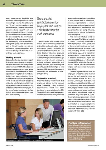 allows employers and training providers to work towards a set of frameworks, enabling organisations to ensure that comprehensive programmes of work experience, traineeships and apprenticeships are being delivered, helping young people to become more employable. This national initiative could be used alongside The National Institute of Adult Continuing Education’s (NIACE) employer toolkit, produced to demonstrate the simple and costeffective actions that employers can take, including around recruitment and ongoing support, to make their apprenticeship programmes open to disabled apprentices. Again, this resource could be pushed out regionally through LEPs, which the Centre for Social Justice has recommended employ work experience champions (CSJ, 2014). There are high satisfaction rates for employers who do take on a disabled learner for work experience or as an apprentice. In NIACE’s work, for example, employers that took part found they were able to extend the pool of high-quality applicants available to them, engage with the widest possible consumer base, and have a workforce that reflects the diverse range of customers they serve (NIACE, 2014). Ensuring that young people are offered meaningful work placements to help them adjust to the workplace is just as important as engaging employers to overcome any preconceptions which they have about employing a young person with SEN.