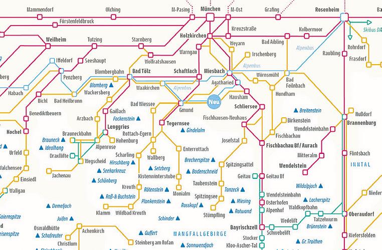Auch in den Bayerischen Alpen gibt es großartige Neuigkeiten: Das MVV-Tarifgebiet erstreckt sich am Alpenrand jetzt bis in den Landkreis Garmisch-Partenkirchen und ist damit so groß wie noch nie. Dazu passend fährt der neue „Alpenbus“, eine schnelle Expresslinie parallel zu den Bergen. Sie verbindet Rosenheim mit Murnau ganzjährig im Stundentakt, werktags und am Wochenende. So sind viele attraktive Touren entlang der Route mög lich, der Umweg über München ist nicht mehr nötig – ein echter Meilenstein. red