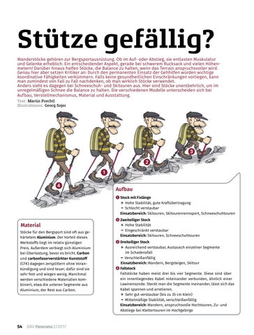 Stütze gefällig? Wanderstöcke gehören zur Bergsportausrüstung. Ob im Auf- oder Abstieg, sie entlasten Muskulatur und Gelenke erheblich. Ein entscheidender Aspekt, gerade bei schwerem Rucksack und vielen Höhen metern! Darüber hinaus helfen Stöcke, die Balance zu halten, wenn das Terrain anspruchsvoller wird. Genau hier aber setzen Kritiker an: Durch den permanenten Einsatz der Gehhilfen würden wichtige koordinative Fähigkeiten verkümmern. Falls keine gesundheitlichen Einschränkungen vorliegen, kann man zumindest von Fall zu Fall nachdenken, ob man wirklich Stöcke verwendet. Anders sieht es dagegen bei Schneeschuh- und Skitouren aus. Hier sind Stöcke unentbehrlich, um im unregelmäßigen Schnee die Balance zu halten. Die verschiedenen Modelle unterscheiden sich bei Aufbau, Verstellmechanismus, Material und Ausstattung. Text: Martin Prechtl Illustrationen: Georg Sojer
