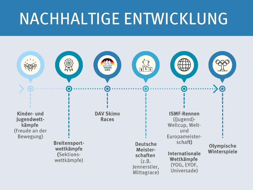 Das vom DAV vorgegebene Verbandsziel definiert sich an der Erreichung der Weltklasse in allen Disziplinen aller Sportarten des DAV. Dieses Ziel ist im Bereich Skimo mit der Etablierung als Top 5 Nation definiert. Individuelle Athletenziele können dabei anderweitig ausgelegt sein. Der derzeitige Top 20 Altersmedian im Weltcup zwischen 27 bis 28 Jahren ermöglicht einen langfristigen und zukunftsorientierten Leistungsaufbau. Das unterstützt die Grundphilosophie des DAV einer multisportiven, möglichst breitausgelegten Grundausbildung der Athlet*innen. Diese begründet sich in den komplexen Wettkampfanforderungen, welche sich in Aufstiegs-, Wechsel- und Abfahrttechniken untergliedern. Zudem finden die Wettkämpfe in einer alpinen Umgebung statt, welche eine alpine Grundausbildung der Athlet*innen, vorrangig im Bereich der alpinen Sicherheit, erfordert.
