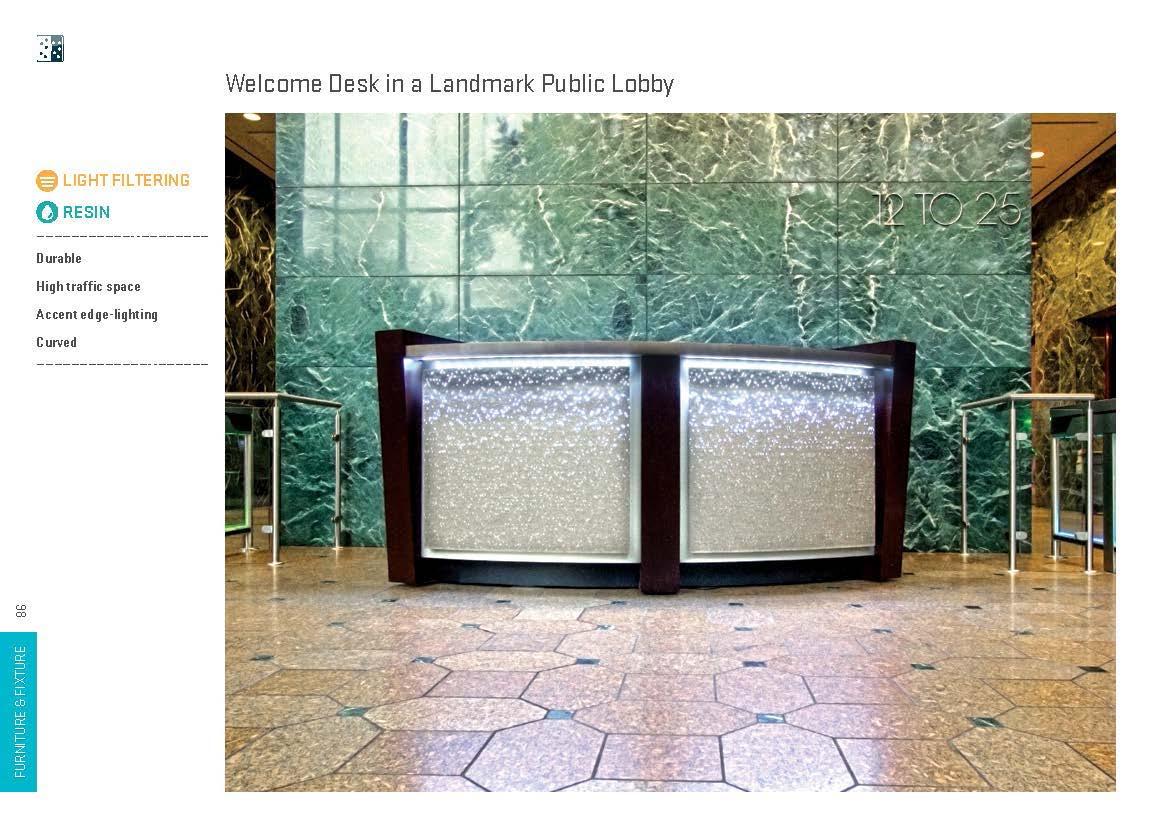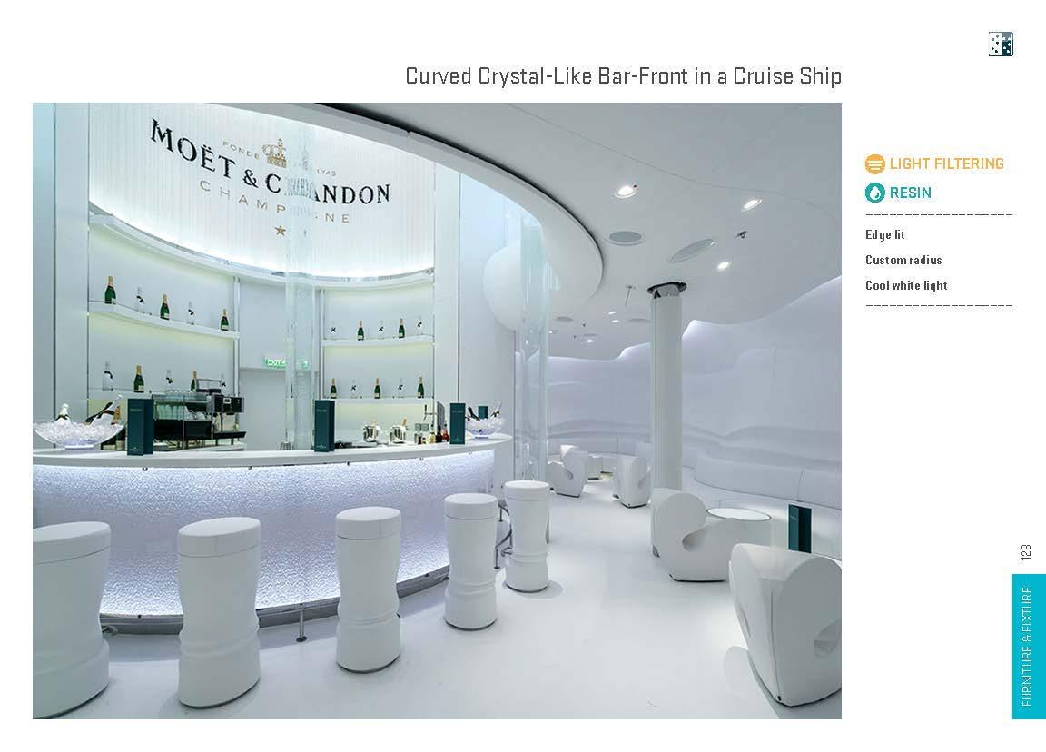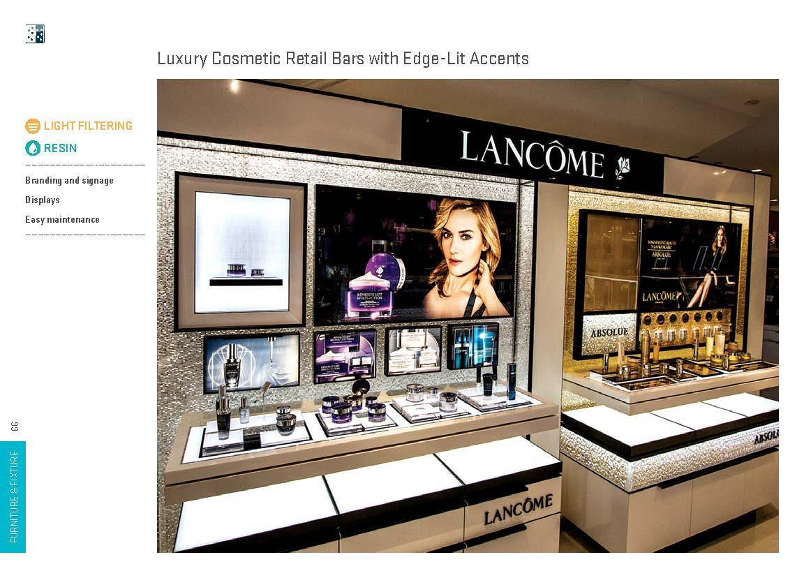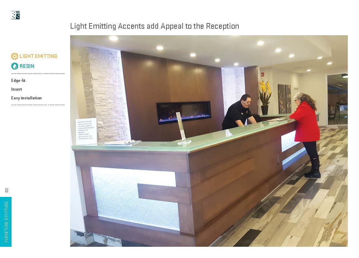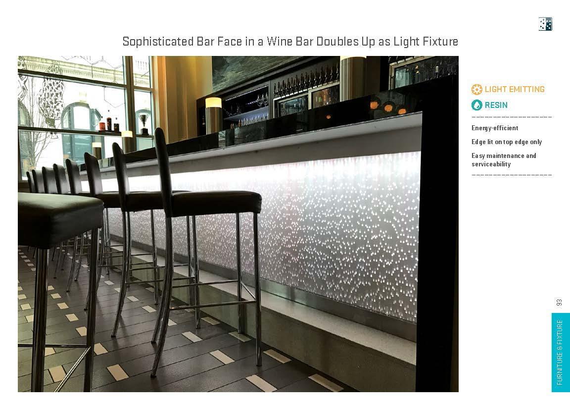 Creative furniture and fixture designs have been realized with light manipulating materials in a wide range of applications, including shelves, displays, tables, seats, accents, horizontal surfaces, dimensional surfaces and complex monolithic pieces. These installations lend themselves to both commercial and residential environments.