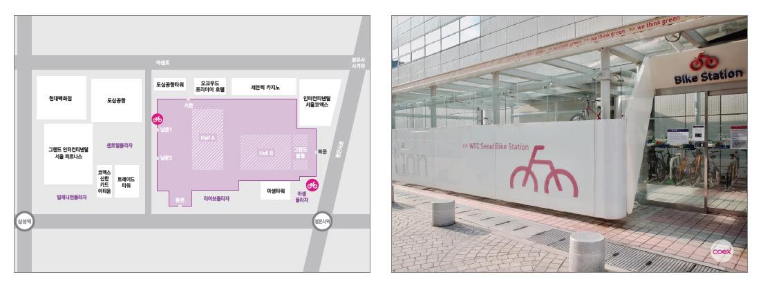 자전거 주차장 홈페이지 공유 녹색교통활동 촉진을 위해 자전거 주차장 및 보관소를 홈페이지에 공유하였습니다. 코엑스 내 운영 중인 총 150대의 자전거 거치대가 설치된 자전거 주차장(트레이드타워 후문 5대, 아셈타워 후문 25대, 전시 컨벤션 남문 120대)을 안내하고 있습니다.