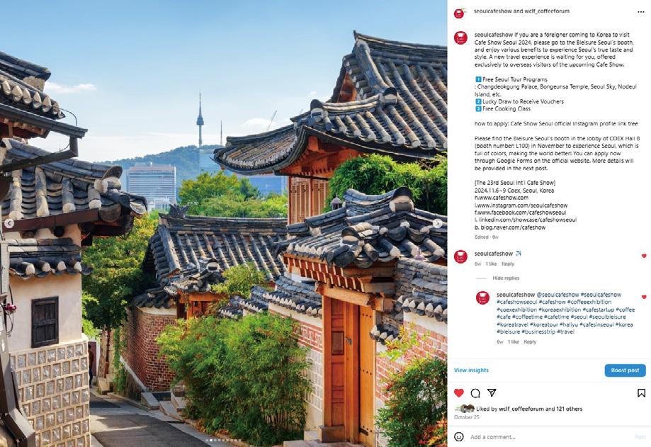 서울 나이트 투어 또한, 서울카페쇼는 한국관광공사와 협력하여, 월드커피리더스포럼의 해외 연사와 산업 종사자들을 포함한 모든 이해관계자들을 대상으로 서울의 전통 음식 체험과 서울 야경 투어 프로그램을 운영했습니다. 이 프로그램은 참 가자들이 서울의 전통적인 맛과 함께, 서울의 아름다운 야경을 즐기며 문화적 교류를 증진시키는 기회를 제공하 였습니다.