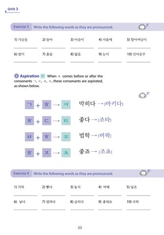 Aspiration ㅎ When ㅎ comes before or after the consonants ㄱ, ㄷ, ㅂ, ㅈ, these consonants are aspirated, as shown below. 2