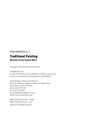 Traditional Painting Window on the Korean Mind Copyright Š 2010 by The Korea Foundation All Rights Reserved. No part of this book may be reproduced or utilized in any form or by any means without the written permission of the publisher. First Published in 2010 by Seoul Selection B1 Korean Publishers Association Bldg., 105-2 Sagan-dong, Jongno-gu, Seoul 110-190, Korea Phone: (82-2) 734-9567 Fax: (82-2) 734-9562 Email: publisher@seoulselection.com Website: www.seoulselection.com ISBN: 978-89-91913-74-5 ISBN: 978-89-91913-70-7