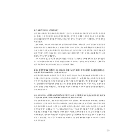 올해는 한국전쟁 발발 60주년이 되는 해입니다. 이를 기념하기 위해서 한국에서 많은 행사들이 개최됩니다. 전쟁 동안 한국인들에게 어떤 인상을 받으셨나요? 다른 동맹국들로부터도 한국에서 받았던 만큼의 지지만 받을 수 있다면 좋겠습니다. 한국인들은 전적으로 우리를 지원해 주었어요. 아시겠지만, 어떤 나라에서는 협조를 얻기 무척 힘들었고, 오히려 우리를 적대시 하며 싸우기도 했습니다. 하지만 한국인들은 굳건한 지지를 보여주었습니다. 한국에 대해서 많이 배웠습니 다. 알면 알수록 한국인들에게 감명을 받습니다. 한국은 훌륭한 동맹국입니다. 미국이 베트남 전쟁에서 싸 울 때, 한국은 군대를 보냈습니다. 그렇게 짧은 시간에 경제성장을 이룩하고 훌륭한 군대를 양성했습니다. 정말 대단한 일이죠.