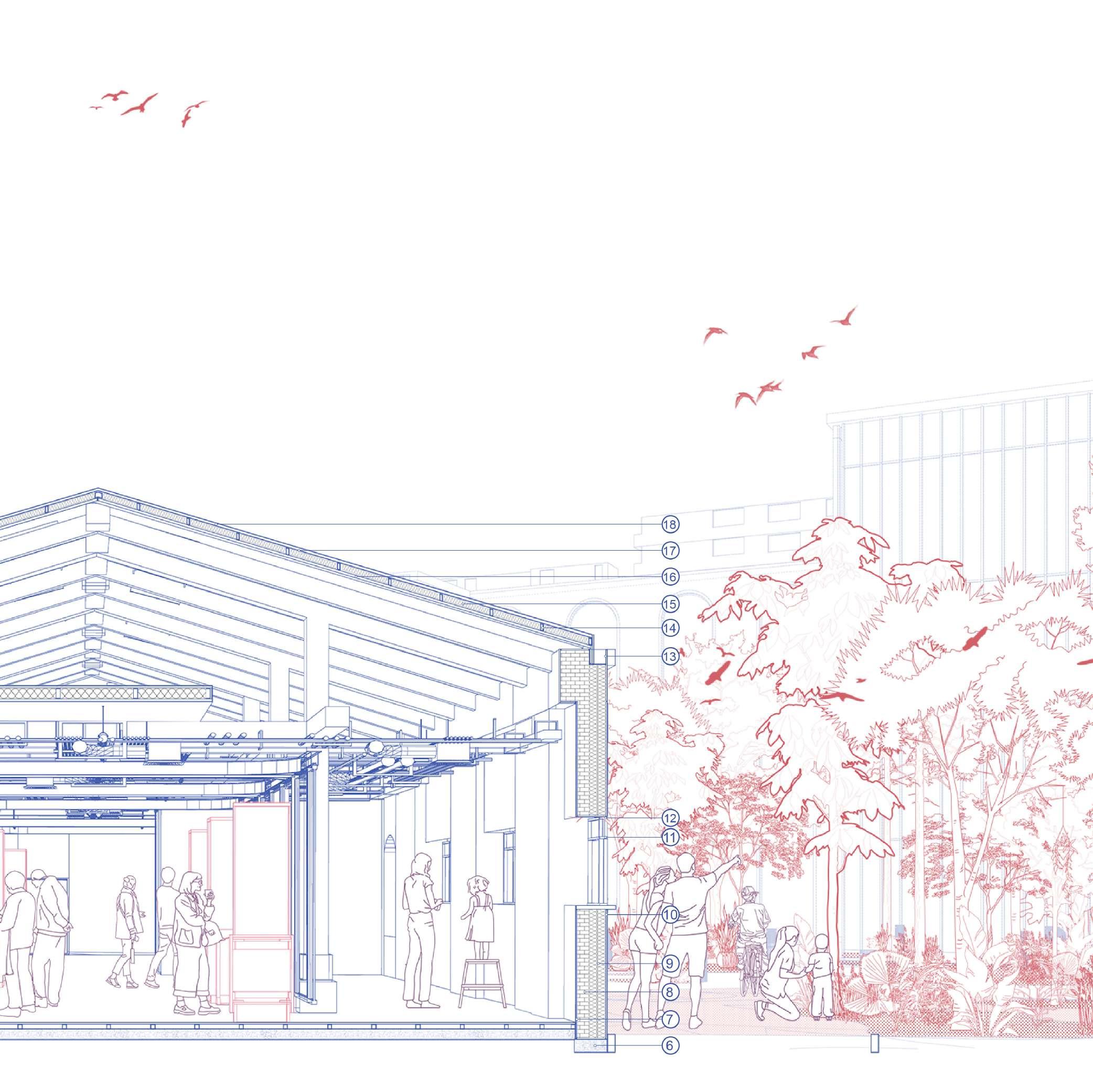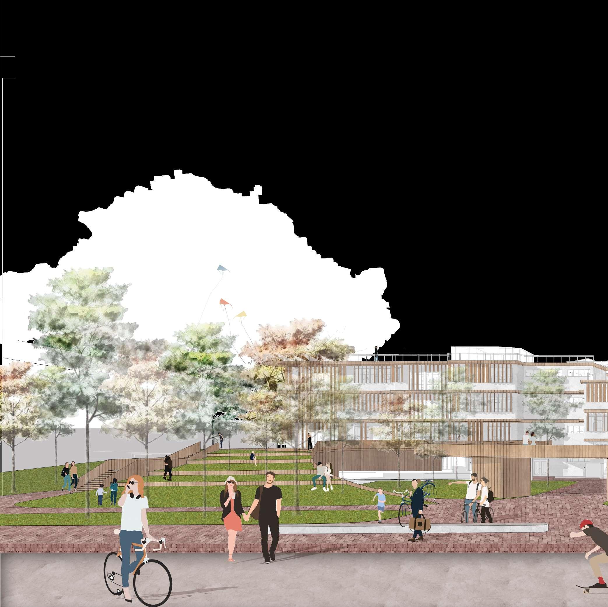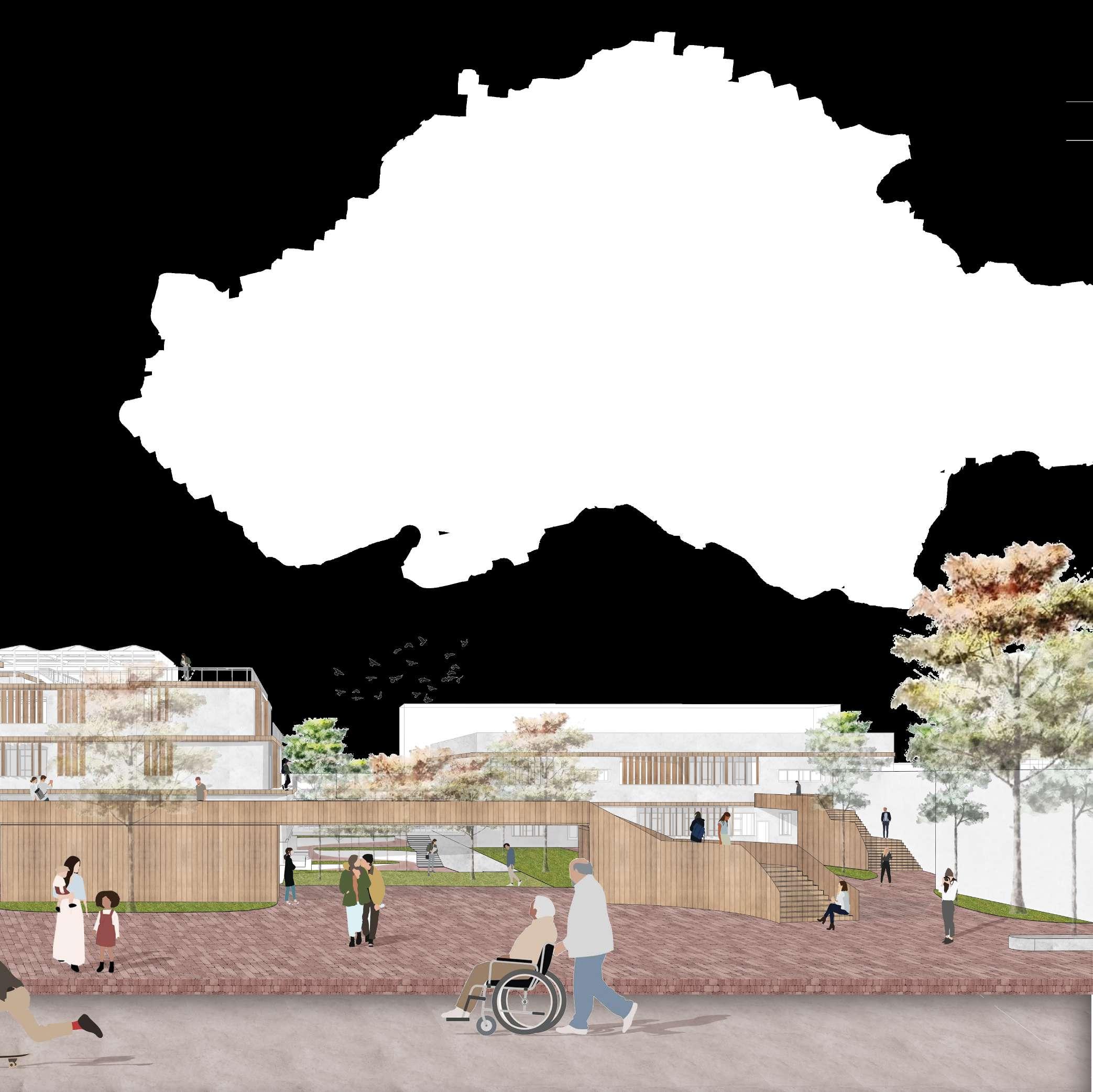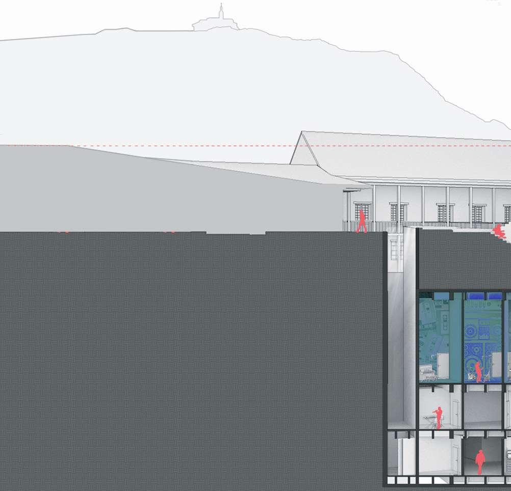 On this matter, our proposal was to first, conceive the ensemble like the building itself, conecting to the buildings in different levels, to the campus by creating different zones that start from the collective imaginary of what the place has been, to the patrimony by a respectful height and materials, to circulation by creating new paths to previously conceived places, to nature, since our proposal not only did not cut off any tree but actually deviates to protect an ancient cypress. Last but not least, to the architectural program, by growing above level 0 to provide natural light and ventilation to classrooms, offices, parks, connections, etc, and bellow level 0 to provide silence and controlled lighting to recording studios, auditoriums, laboratories and so on.