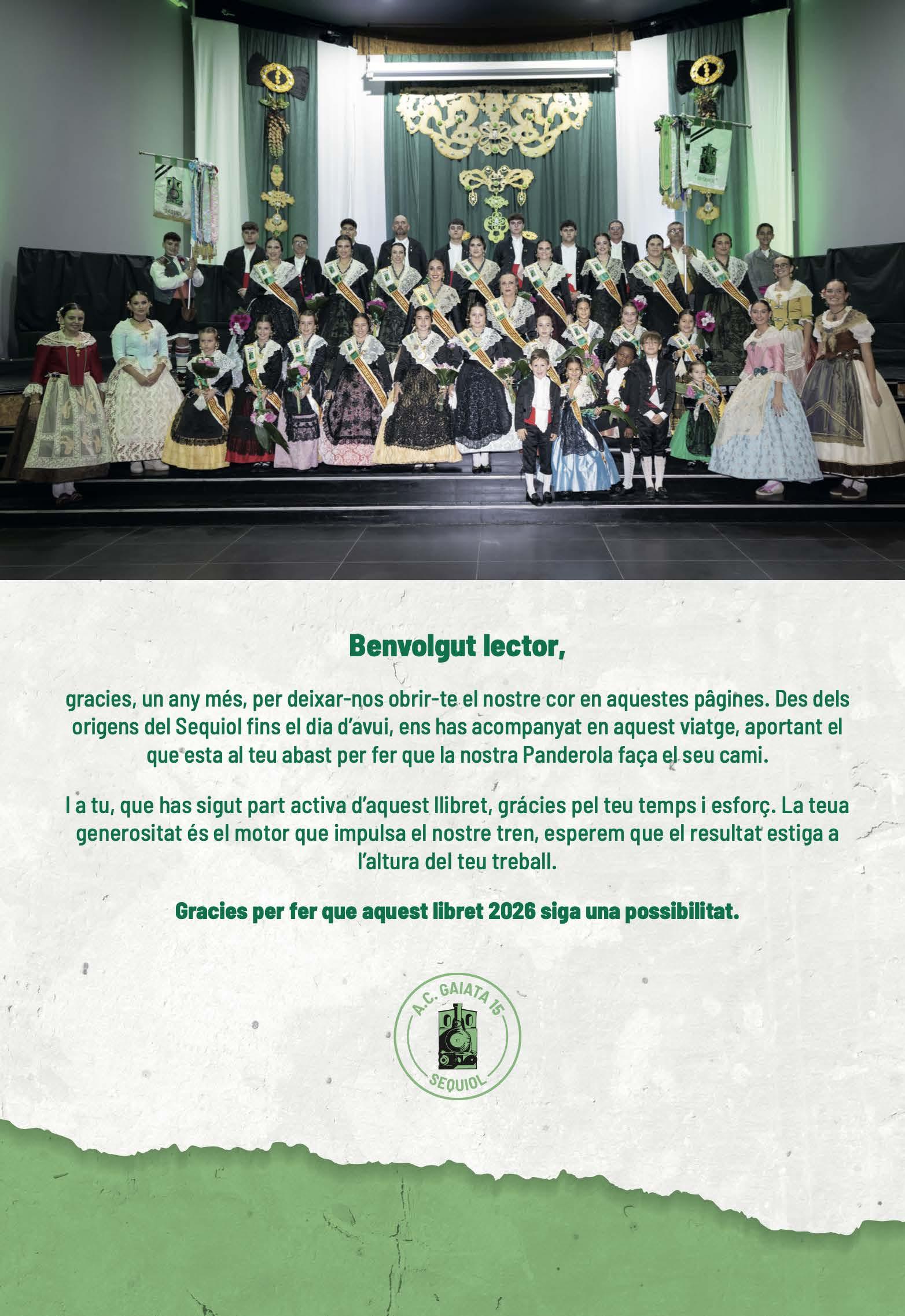 I creieu-me si us dic que ha estat una tasca fàcil. Fàcil perquè totes les persones que formen esta comissió són compromeses, treballadores i, de forma abnegada, no escatimen esforços darrere d’un objectiu comú. Les persones de Sequiol som especials, tant, que esta comissió és una segona família per a totes nosaltres. Així, és molt senzill treballar. I treballar bé, la qual cosa és sinònim d’èxit. Un èxit que és de totes i tots: de les persones comissionades, de les nostres sòcies i socis, col·laboradores i col·laboradors, i de tot el veïnat del sector. Perquè totes hem de sentir-nos orgulloses de pertànyer a esta Gaiata, de lluir en el nostre pit la insígnia de La Panderola. I enguany, en esta Magdalena 2026, totes les persones de Sequiol tindrem un referent: la nostra “Llum de Primavera”, la Gaiata infantil del Sequiol de la Magdalena 2025, il·luminarà la plaça Major, a l’ombra del Fadrí, com a Gaiata infantil de la ciutat, honor que li correspon com a guanyadora del concurs de Gaiates de la Magdalena 2025.