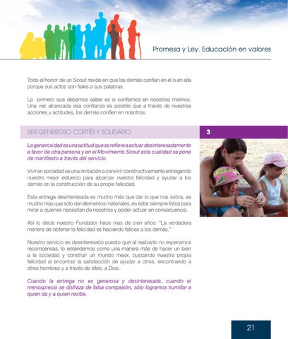 La generosidad es una actitud que se refiere a actuar desinteresadamente a favor de otra persona y en el Movimiento Scout esta cualidad se pone de manifiesto a través del servicio. Vivir en sociedad es una invitación a convivir constructivamente entregando nuestro mejor esfuerzo para alcanzar nuestra felicidad y ayudar a los demás en la construcción de su propia felicidad. Esta entrega desinteresada es mucho más que dar lo que nos sobra, es mucho más que sólo dar elementos materiales, es estar siempre listos para mirar a quienes necesitan de nosotros y poder actuar en consecuencia. Así lo decía nuestro Fundador hace mas de cien años: “La verdadera manera de obtener la felicidad es haciendo felices a los demás.” Nuestro servicio es desinteresado puesto que al realizarlo no esperamos recompensas, lo entendemos como una manera más de hacer un bien a la sociedad y construir un mundo mejor, buscando nuestra propia felicidad al encontrar la satisfacción de ayudar a otros, encontrando a otros hombres y a través de ellos, a Dios. Cuando la entrega no es generosa y desinteresada, cuando el menosprecio se disfraza de falsa compasión, sólo logramos humillar a quien da y a quien recibe.