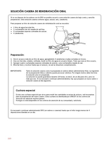SOLUCIÓN CASERA DE REHIDRATACIÓN ORAL Si no se dispone de los sobres con la SRO es posible recurrir a una solución casera de bajo costo y sencilla preparación. Esta solución casera contiene agua, azúcar, sal y zanahoria. Para preparar un litro de solución casera de rehidratación oral se necesita: • • • •