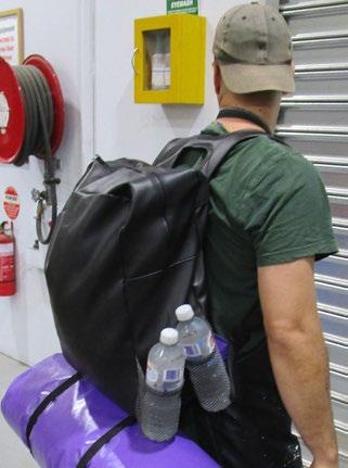 In the textile and leather workshops, offcuts and materials have been saved from landfill and creatively repurposed to make bags to support those impacted by homelessness and help restore dignity as they traverse this difficult time in their lives. The bags which have been designed by prisoners, all who have experienced homelessness or know someone who has, are designed only from waste material available within the prison. Vinyl and workwear fabric are used for the body of the bag with straps, zips, and buckles coming from leftover materials from other production lines. Recently the team have started incorporating repurposed gym mats, making the bags even more durable and waterproof. The bag features hidden pockets for cash or personal documents, along with side holders that can fit two large 2-litre water bottles, and at the bottom there's a detachable swag with a built-in pillow for added comfort.