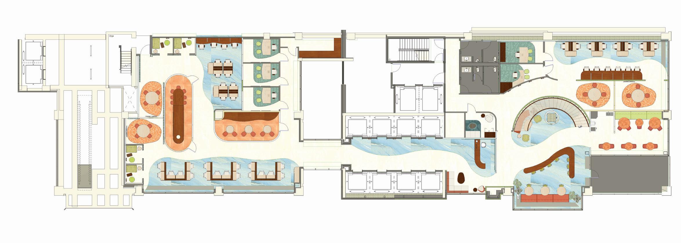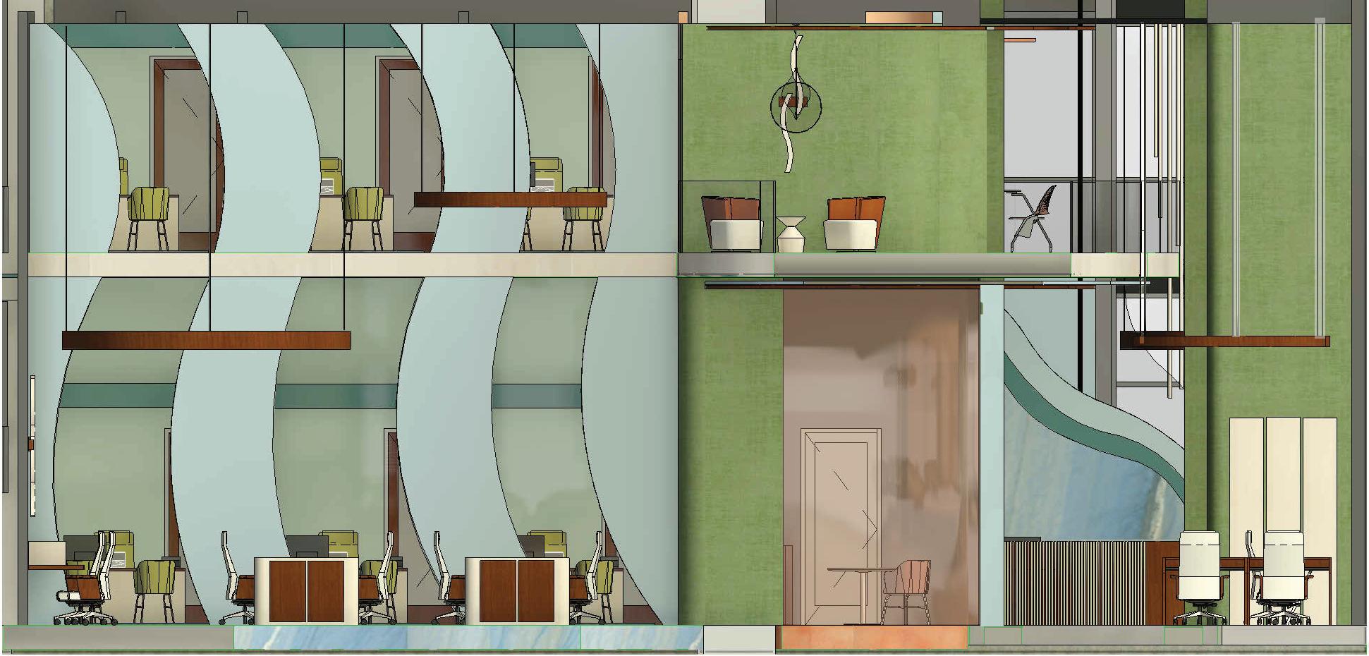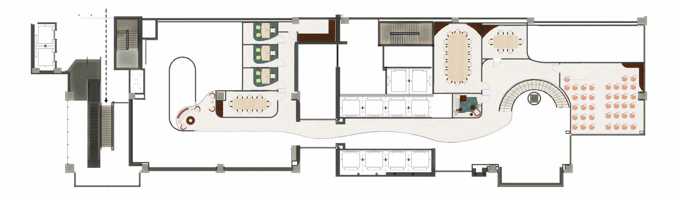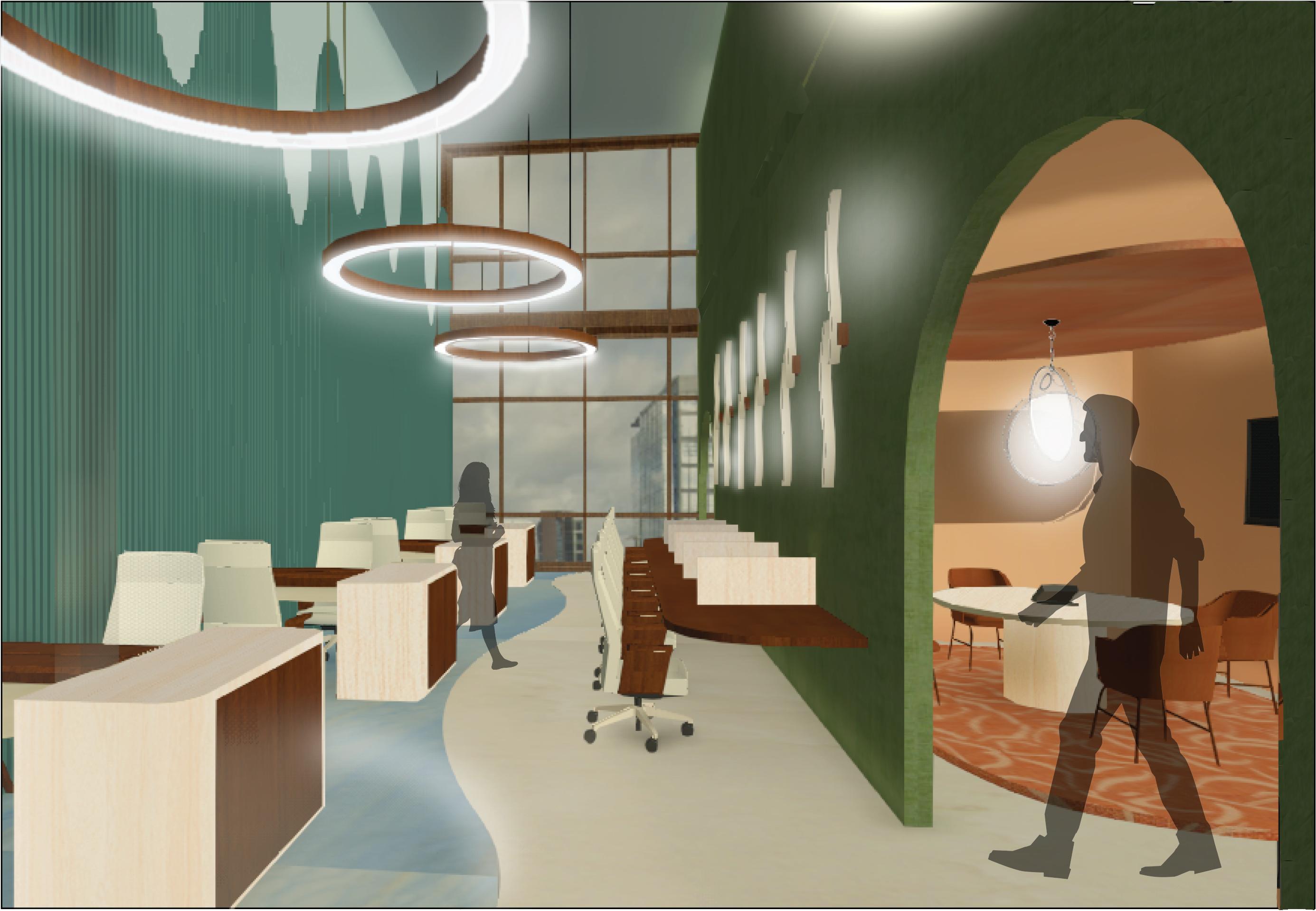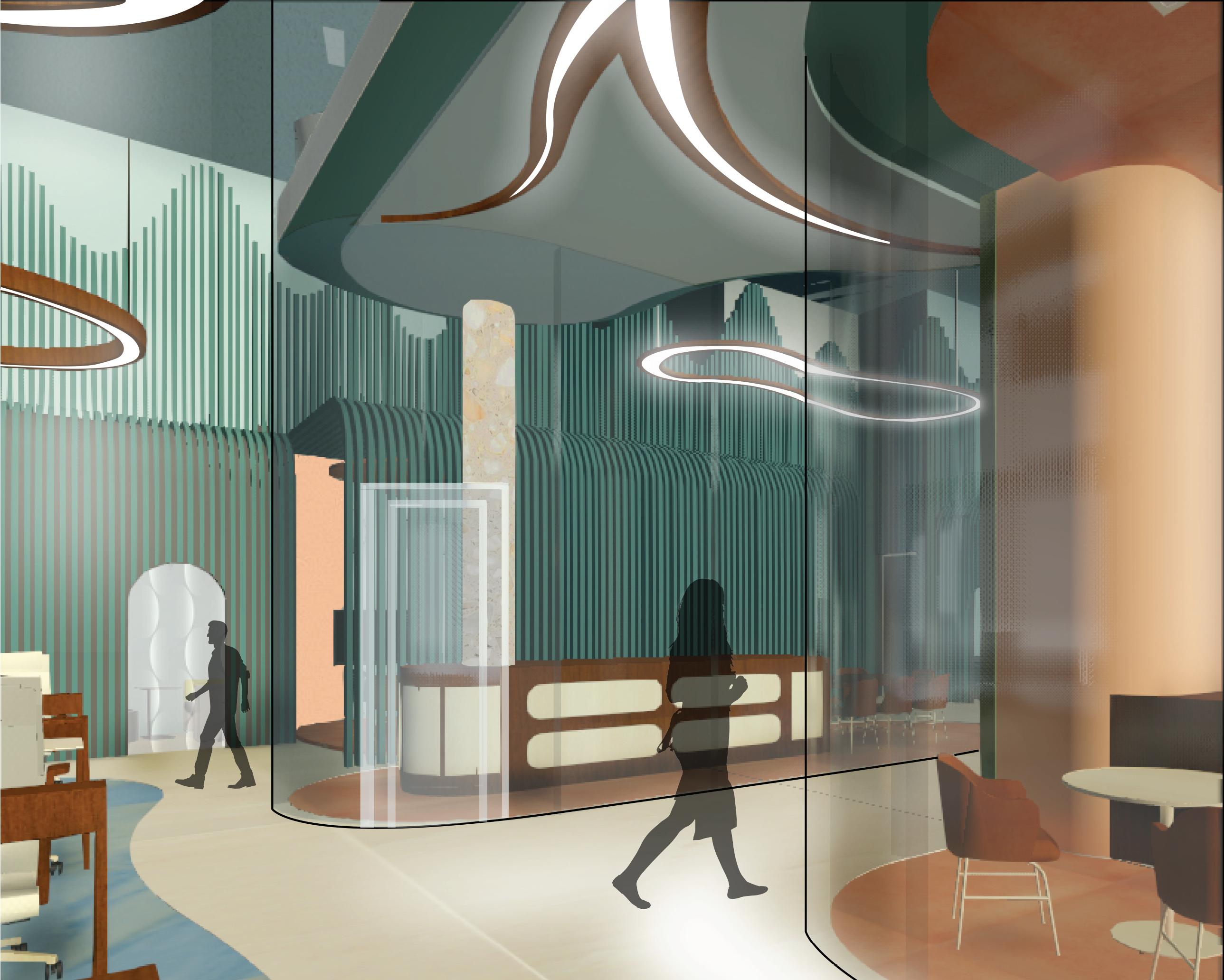 Dallas, Texas is a hub of creativity and divesity, with a large Gen-Z population to help it grow. As this project is set in an adaptable city with influences from many different cutures, it is the perfect location for NEXT to truly demonstrate its community principles. However, not all areas of the city have the same opportunities. Dallas, split by the Trinity River, faces a severe socio-economic divide. At this location, NEXT will be including a community outreach center to help bridge this divide. Using the concept of “fluid forking through open thresholds,” the design mimics the river’s movement through curved form, open plan, and forked divisions. The fluidity will encourage interaction between all users of the space.