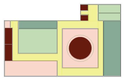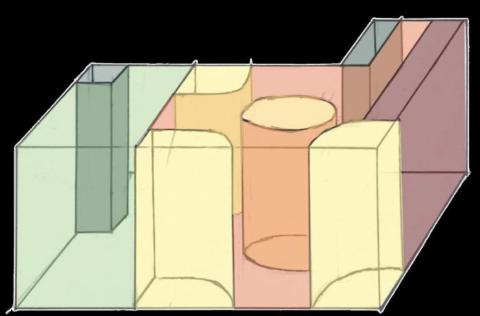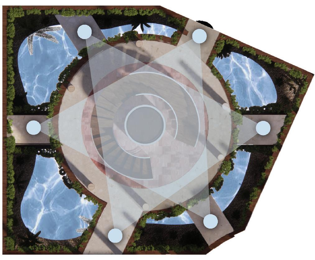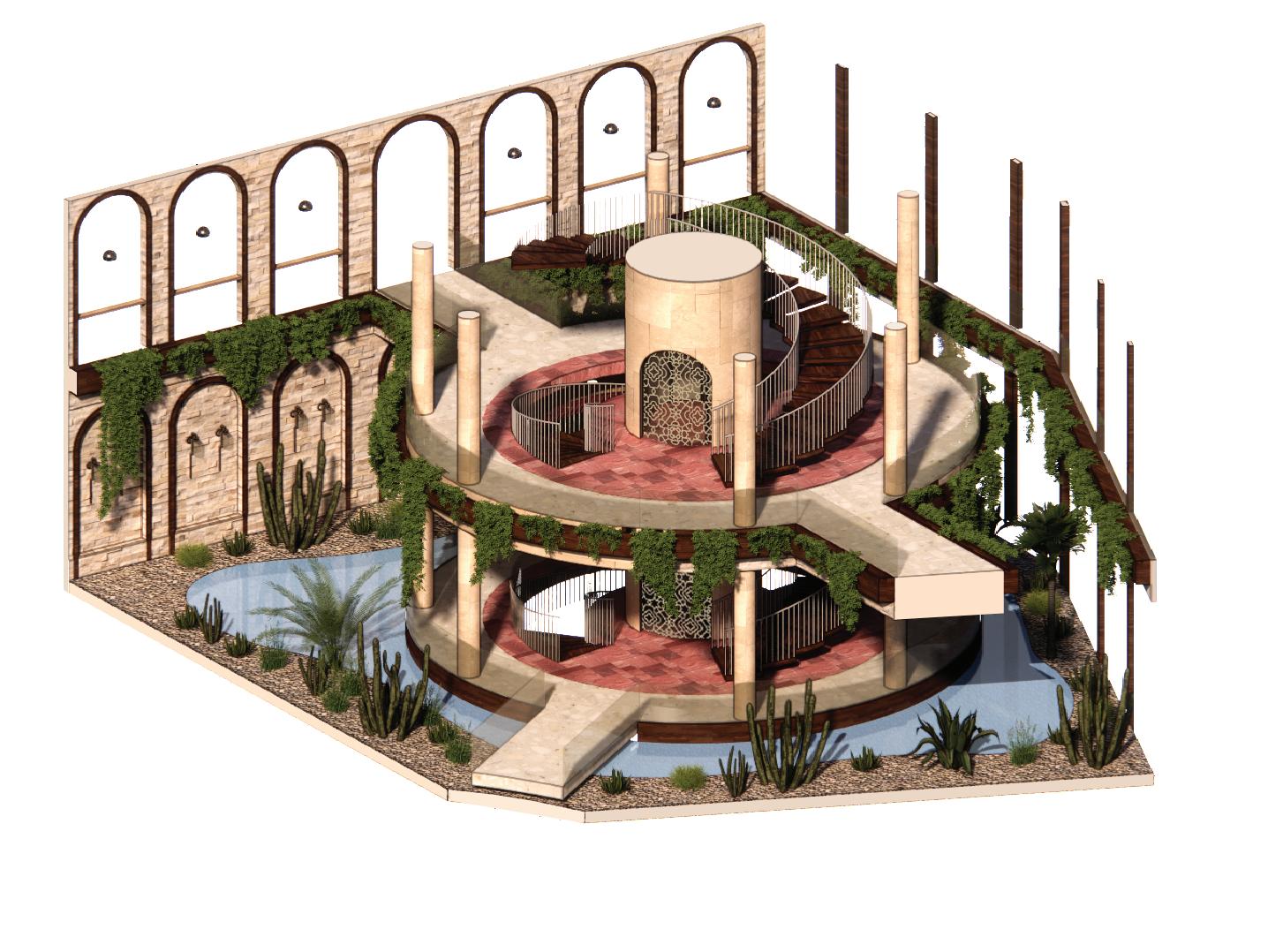 Circular floor cutouts, decreasing in size from the bottom to the top level, represent the cyclical concept in a visual manner.