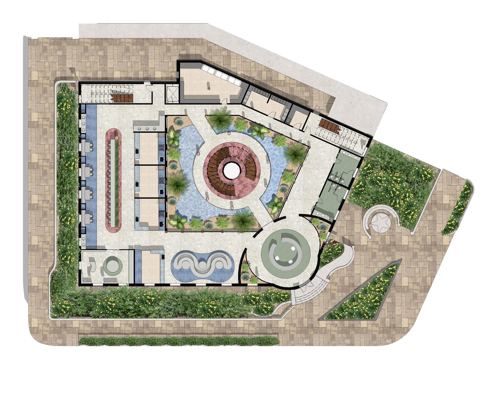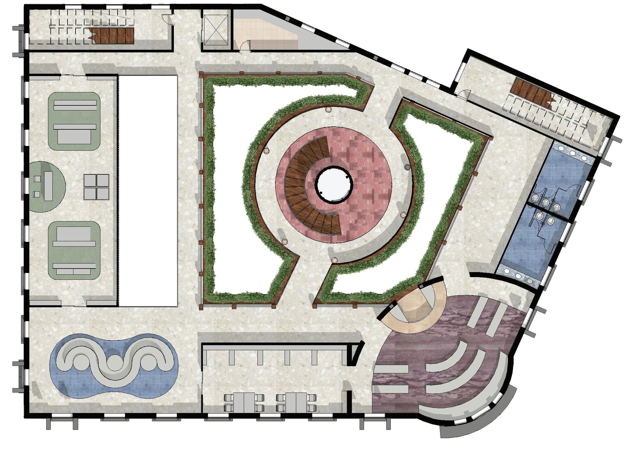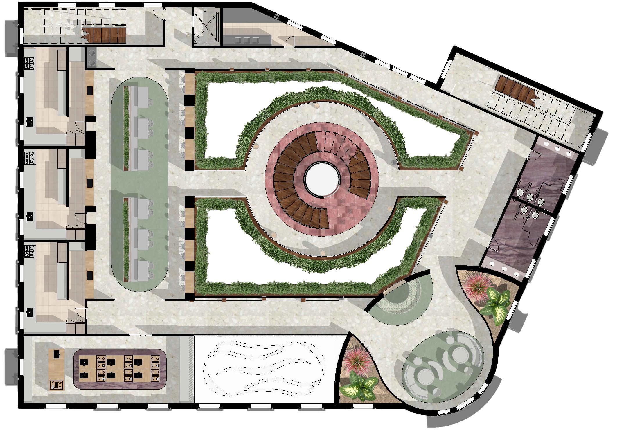 Circular floor cutouts, decreasing in size from the bottom to top level, represent the cyclical concept in a visual manner.