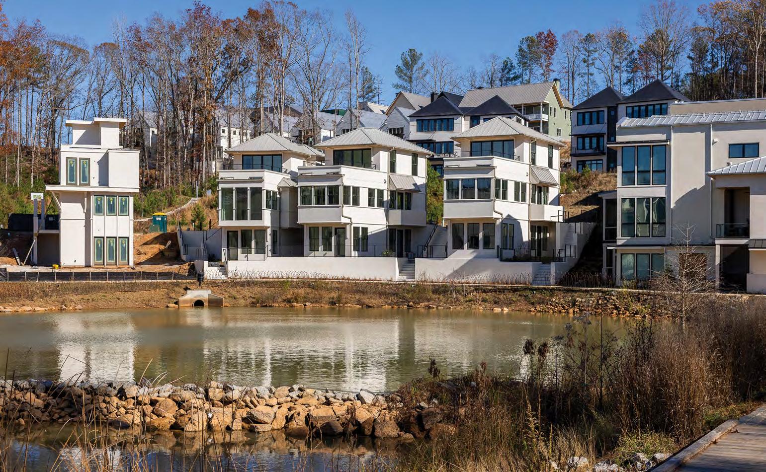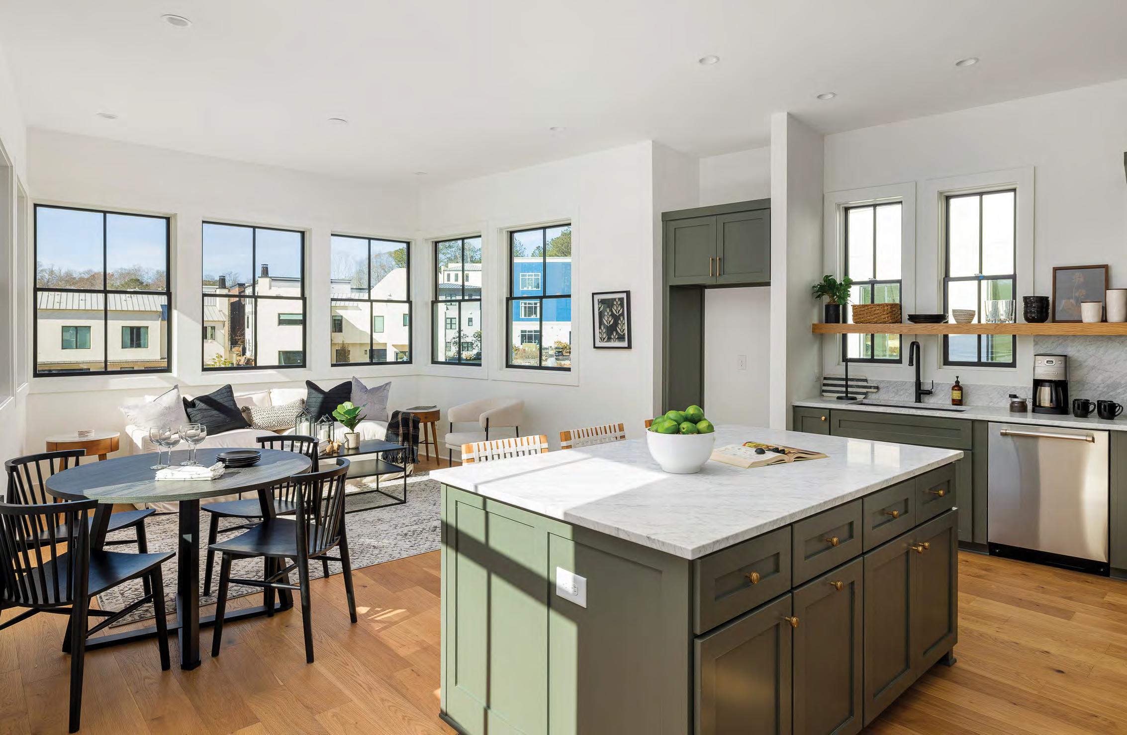 The other available model home is on Lot 454 and overlooks the serene Mado Pond. This stunning, three-story single-family abode was built by McKinney Builders, which boasts more than 50 years of experience building beautiful homes in the southern crescent of greater Atlanta. Tons of natural light sweeps in from expansive windows across all four sides of the home that features three bedrooms, an open-concept kitchen and living room and an expansive, private outdoor patio on the top floor for entertaining or enjoying family time. Sheryl Beveridge lent her interior design expertise to outfitting this model home with comfortable and modern furnishings and fixtures.