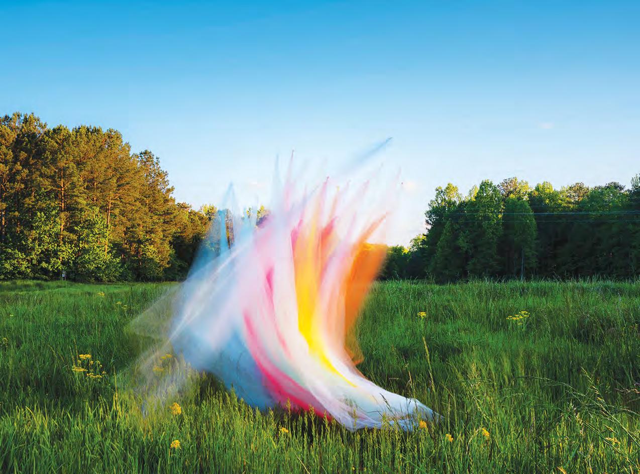 The fir st installation in the woods featured multiple long pieces of colorful tulle that swayed over a lush wooded scenery, and produced two beautiful photographs, “Tulle No. 51” and “Tulle No. 51 (Variant).” To persuade the tulle to move amongst the trees, Jackson borrowed leaf blowers and tapped some volunteer helpers from the community. The second piece, “Tulle No. 52,” also showcased the ethereal fabric; this time, as it danced like fire in the middle of Serenbe’s wildflower meadow. Jackson said when the sun was low in the sky, a magical spotlight came through the trees and illuminated the exact center of the