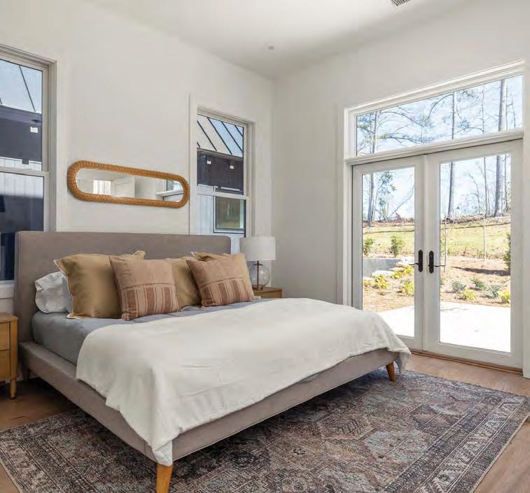 One of Serenbe’s available model homes is a 2,545-square-foot townhouse that sits on Lot 520 on Lupo Loop. Built by 10/23 Construction, which specializes in green, energy-efficient EarthCraft homes, this incredible home features three front porch spaces with views overlooking treetops to fully relish in al fresco lounging. The floor-to-ceiling windows further bring the outdoors in and offer beautiful natural light in the spacious, open-concept living and dining areas as well as three bedrooms on the upper level. Luxurious conveniences include a two-car garage and elevator shaft. Plus, interior staging by award-winning Atlanta-based designer Sarah Bowman, allows potential buyers to fully envision what their own thoughtfully designed rooms could look like.