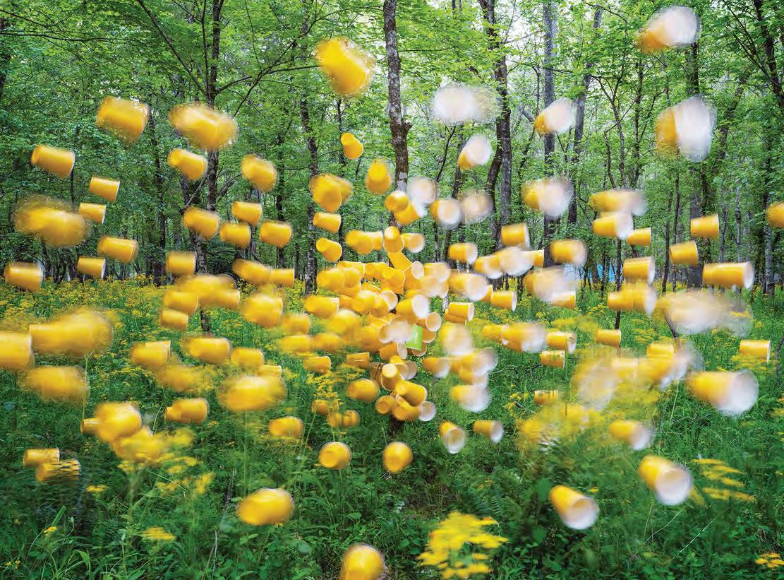 installation. For his third piece, “Cups No. 6,” Jackson purchased yellow solo cups from a nearby store in Palmetto. The vibrant material was strung from tree to tree, contrasting with the woodsy setting and complementing the “super-bloom” of yellow wildflowers beneath it. Listening closely, one could hear it simulate its own clicks and hums amongst its bird and bug counterparts, which was especially lyrical during a rainstorm.