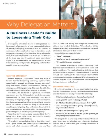 WHY THE STRUGGLE? Su z a n n Foerster, L eadersh ip Coach a nd CEO of Suzann Foerster Leadership Coaching, explained that many leaders struggle to delegate because they don’t fully trust others to meet their standards, fearing the consequences if things go wrong. That fear, she said, often ties back to how it might ref lect on them as a leader. “For some, t he hesitat ion is leg it imate. T heir tea m may not yet have the sk ills or clarit y needed to succeed,” Foerster said. “In those cases, the leader’s real work is to develop their people, not just do the work themselves. But that requires getting off the treadmill and stepping out of t he comfor t of constant doing to invest t ime in coaching and a lig ning. You w ill move slower at f irst, and it may even feel uncomfortable. Yet that temporar y pain is the price of building long-term capacit y.” Accord i ng to Foerster, ma ny leaders t h i n k t hey ’re bei ng c lea r w it h t hei r tea m, but h aven’t ac t u a l l y achieved shared understanding. “Tr ue cla r it y mea ns being able to descr ibe exact ly w hat ‘good’ look s l i ke, w hat qu a l it y st a nda rd s to meet, a nd w hat outcomes w i l l ma ke you say, ‘Yes,
