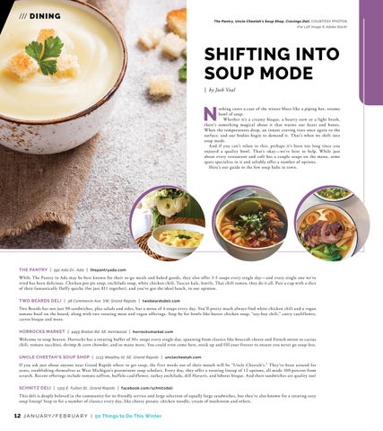 THE PANTRY | 591 Ada Dr., Ada | thepantryada.com W hile The Pantry in Ada may be best known for their to-go meals and baked goods, they also offer 3-5 soups every single day—and every single one we’ve tried has been delicious. Chicken pot pie soup, enchilada soup, white chicken chili, Tuscan kale, lentils, Thai chili ramen, they do it all. Pair a cup with a slice of their fantastically f luff y quiche (for just $11 together), and you’ve got the ideal lunch, in our opinion. TWO BEARDS DELI | 38 Commerce Ave. SW, Grand Rapids | twobeardsdeli.com Two Beards has not just 90 sandwiches, plus salads and sides, but a menu of 4 soups every day. You’ll pretty much always f ind white chicken chili and a vegan tomato basil on the board, along with two rotating meat and vegan offerings. Stop by for bowls like butter chicken soup, “soy-boy chili,” curry caulif lower, carrot bisque and more. HORROCKS MARKET | 4455 Breton Rd. SE, Kentwood | horrocksmarket.com Welcome to soup heaven. Horrocks has a rotating buffet of 30+ soups every single day, spanning from classics like broccoli cheese and French onion to cactus chili, tomato zucchini, shrimp & corn chowder, and so many more. You could even come here, stock up and f ill your freezer to ensure you never go soup-less. UNCLE CHEETAH’S SOUP SHOP | 1133 Wealthy St. SE, Grand Rapids | unclecheetah.com If you ask just about anyone near Grand Rapids where to get soup, the f irst words out of their mouth will be “Uncle Cheetah’s.” They’ve been around for years, establishing themselves as West Michigan’s preeminent soup scholars. Every day, they offer a rotating lineup of 12 options, all made 100 percent from scratch. Recent offerings include tomato saffron, buffalo caulif lower, turkey enchilada, dill Havarti, and lobster bisque. And their sandwiches are quality too! SCHNITZ DELI | 1315 E. Fulton St., Grand Rapids | facebook.com/schnitzdeli This deli is deeply beloved in the community for its friendly service and large selection of equally large sandwiches, but they’re also known for a rotating cozy soup lineup! Stop in for a number of classics every day, like cheesy potato, chicken noodle, cream of mushroom and others.