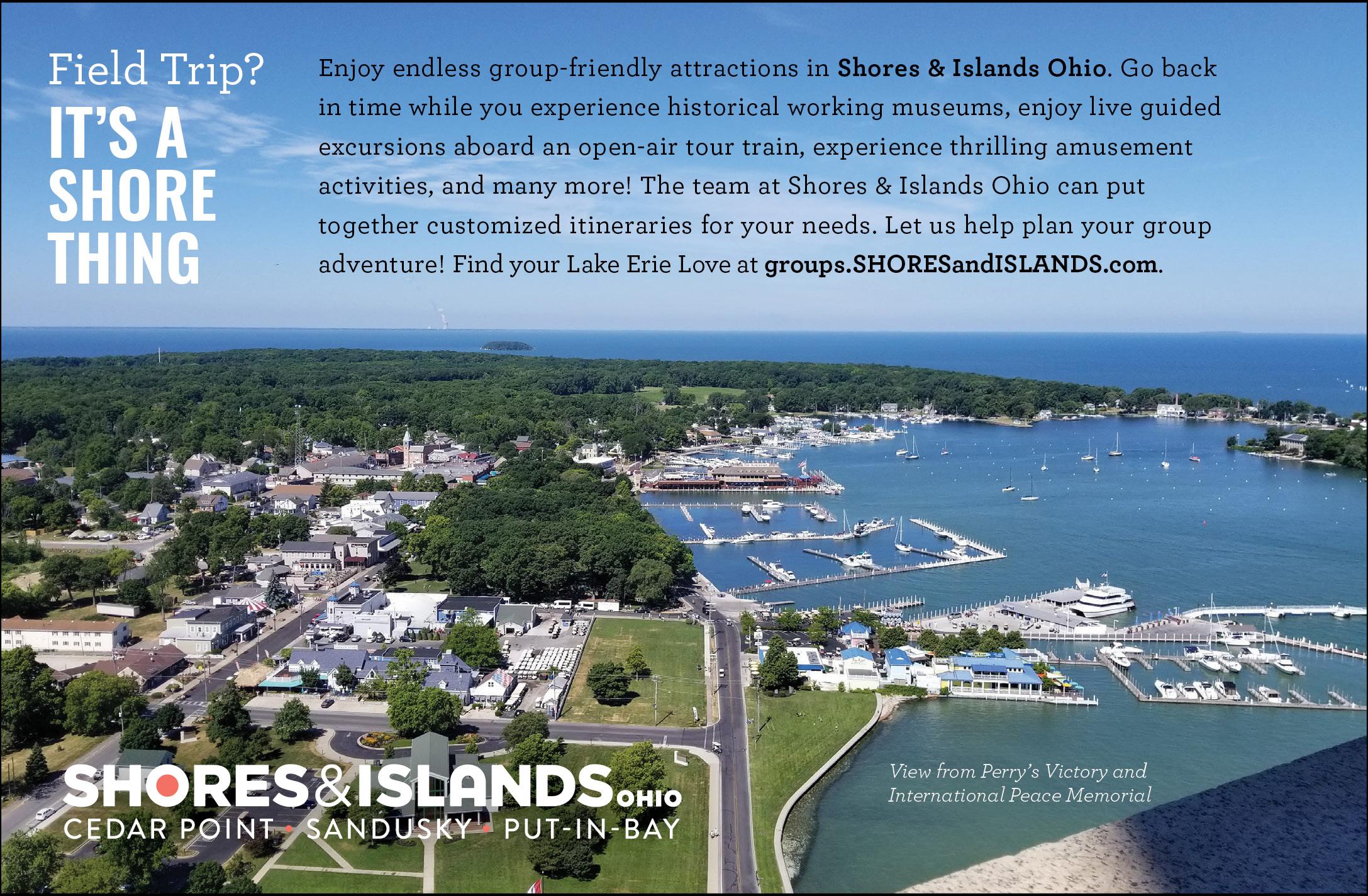 Shores & Islands Ohio is home to the stunning observation deck at Perry’s Victory and International Peace Memorial at Put-in-Bay on South Bass Island. A Doric column rising 352-feet over Lake Erie, this monument was established to honor those who fought in the Battle of Lake Erie during the War of 1812. Your students have the incredible opportunity to travel via ferry boat to the island, then to the top of the memorial for jaw-dropping vistas. They will also appreciate a walk through the National Park Service-operated visitor’s center, which offers exhibits around the War of 1812, the armament of the time, the specifics of the battle that turned the tide of the war, and more. For more details, visit shoresandislands.com/ groups.