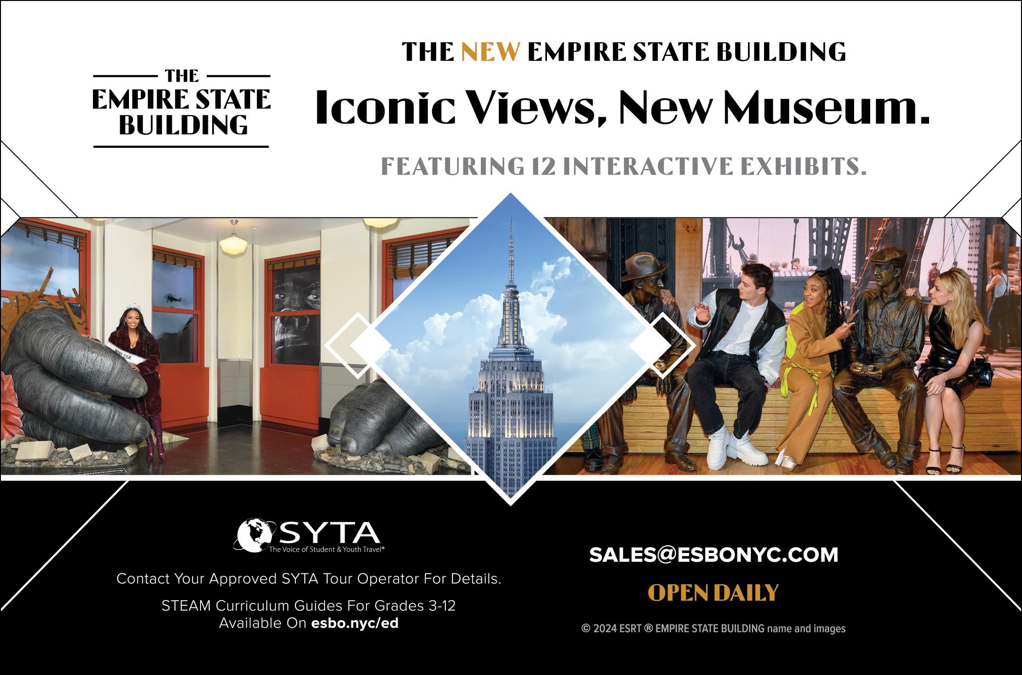 The Empire State Building Observatory Experience features an interactive museum with nine galleries and offers unmatched views from its world-famous 86th and 102nd Floor Observatories. The Observatory Experience was voted the #1 attraction in the world—and the #1 attraction in the U.S. for the third consecutive year—in Tripadvisor’s 2024 Travelers’ Choice Awards: Best of the Best Things to Do. The reimagined Observatory Experience recently updated its complimentary interactive lesson plans for student group visits to the building, in partnership with Bank Street College of Education. The curriculum follows New York State Learning Standards for STEAM (science, technology, engineering, arts, and mathematics) and social studies and features grade-appropriate learning plans for elementary, middle, and high school students. From self-guided group visits to private tours, the Empire State Building Sales team provides tailored experiences for groups of all sizes at esbnyc.com.