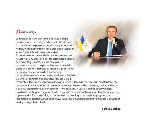 ¡Querido amigo! En tus manos tienes un libro que hace tiempo quería compartir contigo. Esta es mi historia de formación como persona, deportista, patriota de mi país y simplemente un niño que pudo convertir su sueño de infancia en una realidad. A menudo escuchamos decir que los campeones nacen, no se hacen. Pero por mi experiencia puedo decir con seguridad que esto no es así. La perseverancia, auto organización, entrega total, disciplina, amor al trabajo, búsqueda incondicional de su objetivo, capacidad de aprender y perfeccionarse constantemente conducen a los éxitos y las victorias no solo en deporte, sino en la vida. “¡Véncete a ti mismo y vencerás a todos!”, este es el lema de mi vida, que constantemente me ayuda a salir adelante. Cada uno de nosotros posee muchos talentos, de los cuales ni siquiera sospechamos. El principal objetivo es vencer nuestras debilidades y trabajar constantemente para mejorar. Si estás dispuesto a descubrir tus nuevas facetas, atreverte y superar todos los obstáculos, ir con firmeza hacia el logro del objetivo propuesto y realización de tu sueño, este libro te ayudará a no desviarse del camino elegido y encontrar un digno lugar bajo el sol. Serguey Bubka