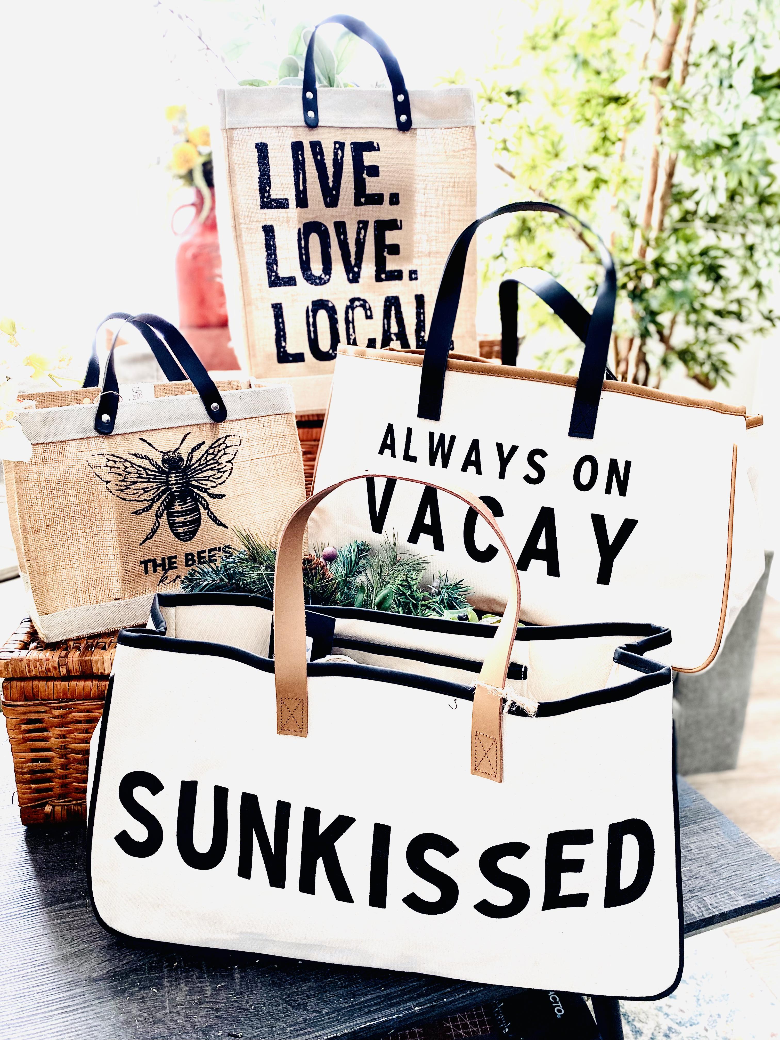 Available at: SKULL CREEK DOCKSIDE Based in Charleston SC., Poppy & Sage is proud to source only sustainable and ethically created products which they then deliver to the masses. The Camilla Bag is made of rattan and leather. 100% handmade in Bali. $ 98.00 b| LIVE. LOVE. LOCAL. MARKET TOTE Available at : NECTAR FARM KITCHEN Great size for a trip to the local market or for a weekend away! Inside pocket for organization. $ 49.00 c| ORIGINAL BOGG BAG LEOPARD TOTE Available at: COASTAL PROVISIONS Unlike other totes, the Bogg Bag won’t tip over, the bottom won’t leak, and at the end of the day, simply hose it off and put it away for your next adventure!