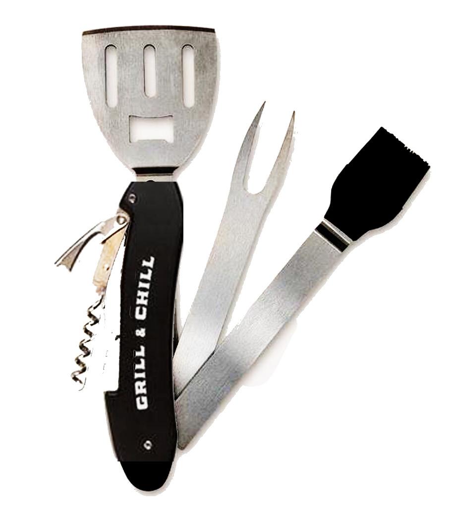 Great tool for any serious griller - The 5 in 1 BBQ TOOL breaks in 2 for two-handed uses. Food grade stainless steel is dishwasher safe. Stainless steel includes: spatula, fork, silicone basting brush, bottle opener and corkscrew $ 18.00