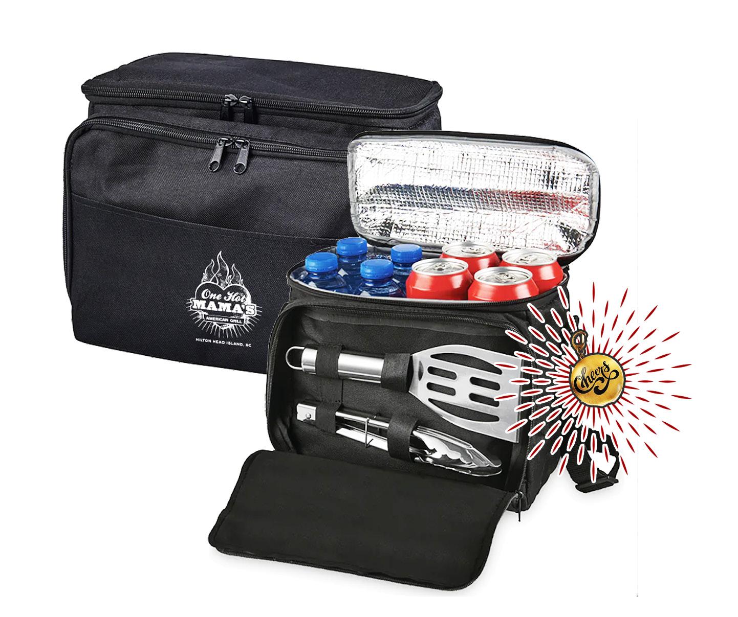 Set includes: stainless steel spatula and tongs. Comes in a One Hot Mama’s insulated cooler with a black zipper pouch and a front open pocket. $ 36.00