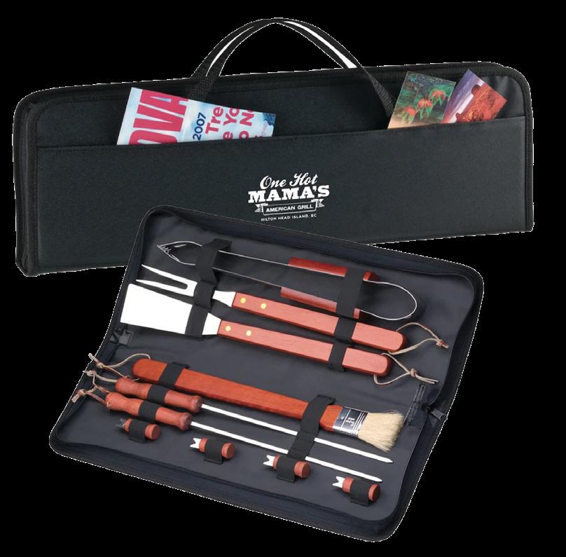 Set includes: spatula, fork, 2 tongs, 2 skewers, basting brush and 4 corn on the cob holders. Comes in a One Hot Mama’s logo’d case with a black zipper pouch and a front open pocket. Double 12” handles $ 32.00
