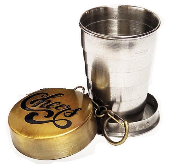Always be prepared with the telescoping steel shot glass with a hand finished, antique brass cap that collapses down to fit in your pocket!