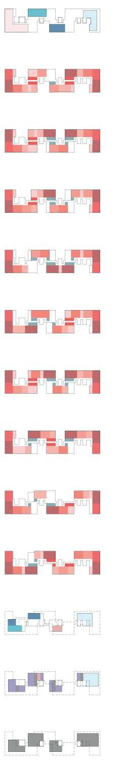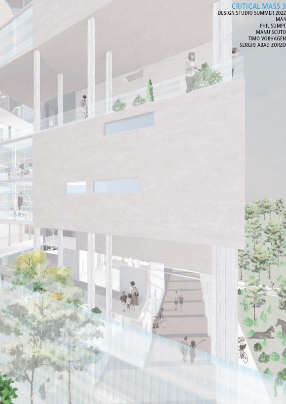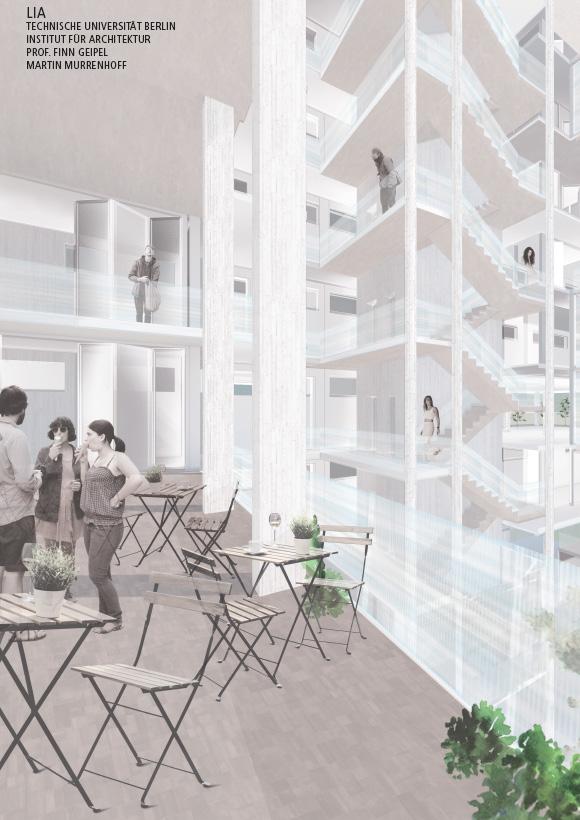 This process of condensing the program of a city, led to the challenge of solving the complexity of a 31,50m deep building with a mostly residential program. Through the implementation of cutouts in the volume, courtyards are created to carry lightto the deeper parts of the building. The apartments are complemented by so-called “Plug-In Rooms”, located in the deepest parts of the plan. These rooms can be appropriated by the residents as either extensions of their flats or shared spaces for the building’s community. The ground, first and top floor offer public programs such as retail, workshops, offices, gyms, a daycare and a viewing deck. Additionally, an environmental learning center supports the many adjacent educational institutions in the area. It also helps to raise awareness of the natural assets of the Neu-Lichterfelde area.