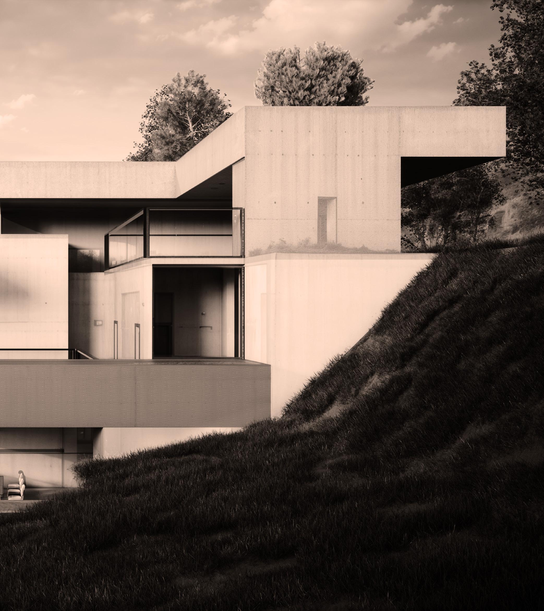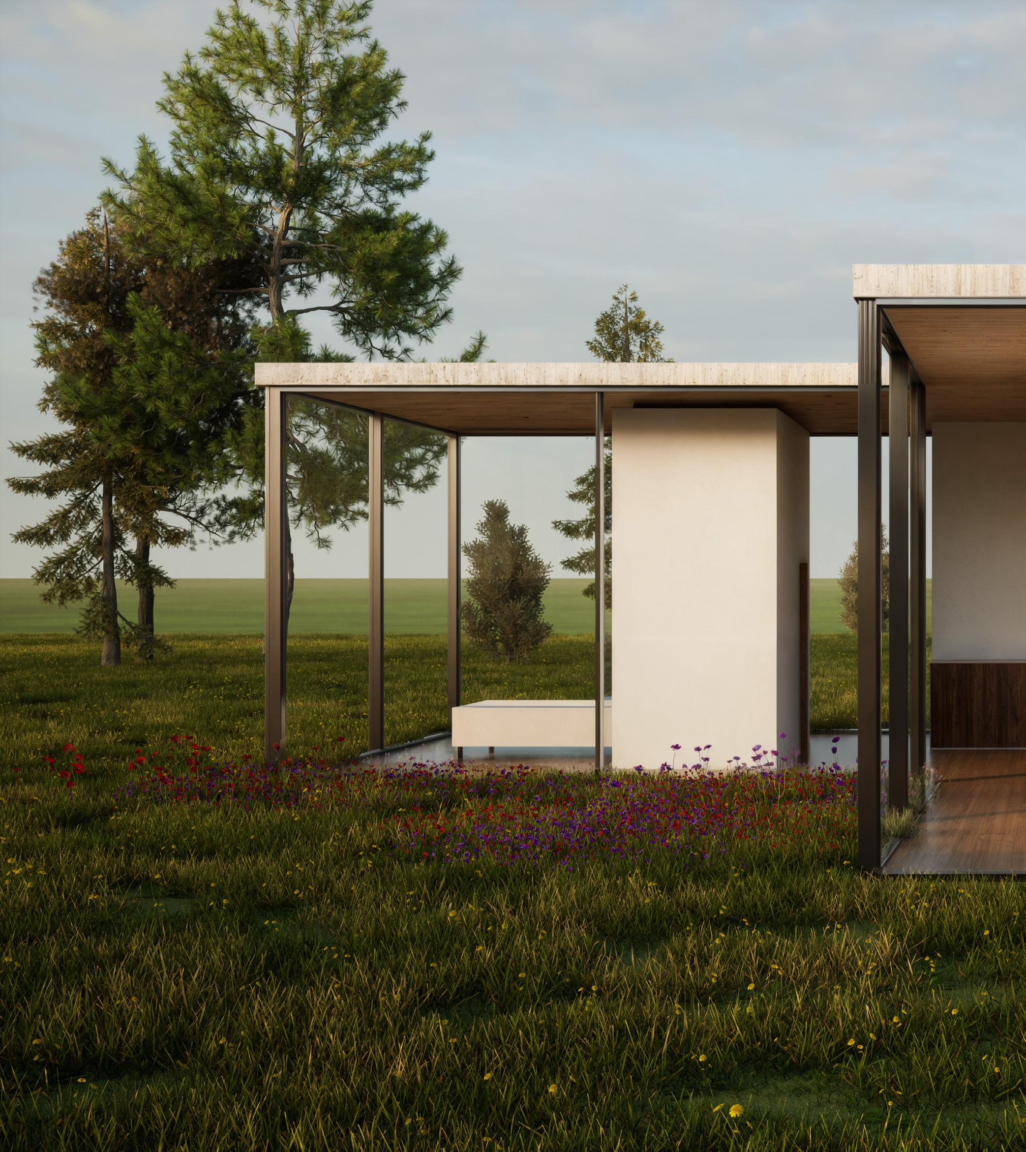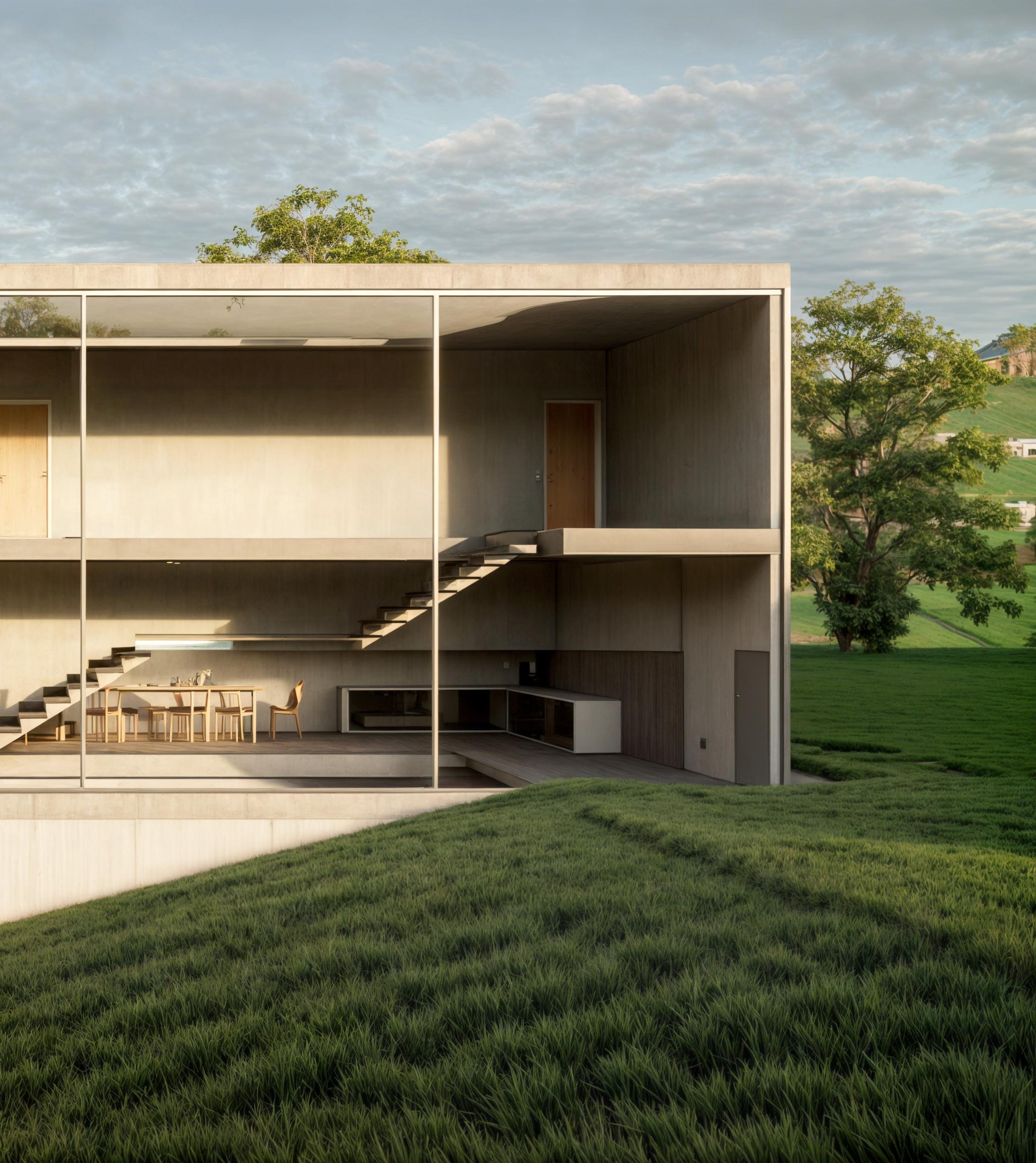 Composta a partir de uma estrutura axial rigorosa, a Casa I organiza seus volumes segundo uma lógica de simetria e repetição. As relações entre cheios e vazios seguem um ritmo regular, evocando estabilidade e coerência formal.
