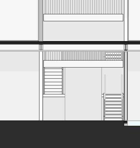 O corte revela a articulação entre os planos estruturais e os cheios e vazios modulados. A repetição vertical e a continuidade espacial reforçam a leitura do ritmo arquitetônico, criando uma hierarquia clara entre espaços de transição e permanência.