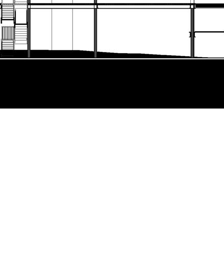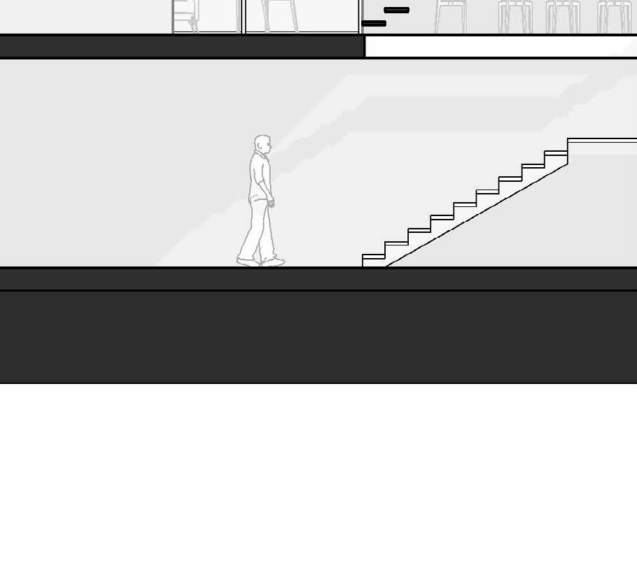 As variações de altura e profundidade reveladas no corte evidenciam o encadeamento entre planos estruturais e espaços abertos, acentuando a dinâmica interna do projeto. Esses desníveis reforçam o ritmo espacial e criam diferentes camadas de percepção. A luz natural atravessa a composição longitudinalmente, promovendo continuidade entre interior e exterior e valorizando a fluidez dos espaços.