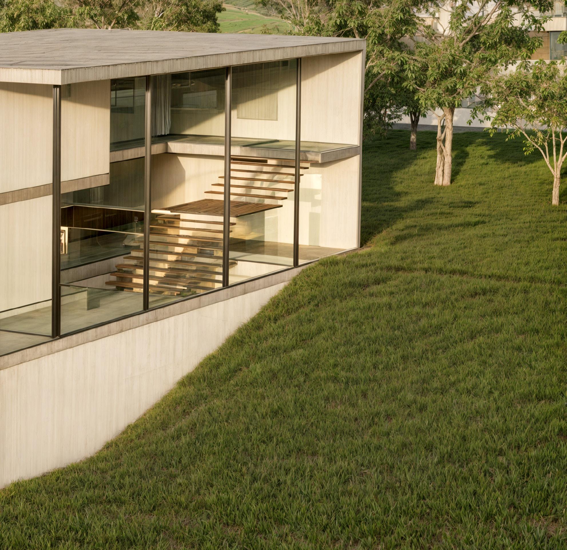 Para interligar os quatro volumes que compõem o projeto, uma foi adicionada acima do nível térreo, permitindo a conexão edificações servindo como um elemento de conexão de todo Em partes específicas desta marquise, foi pensado um jardins e espelhos dàgua proporcionando um percurso