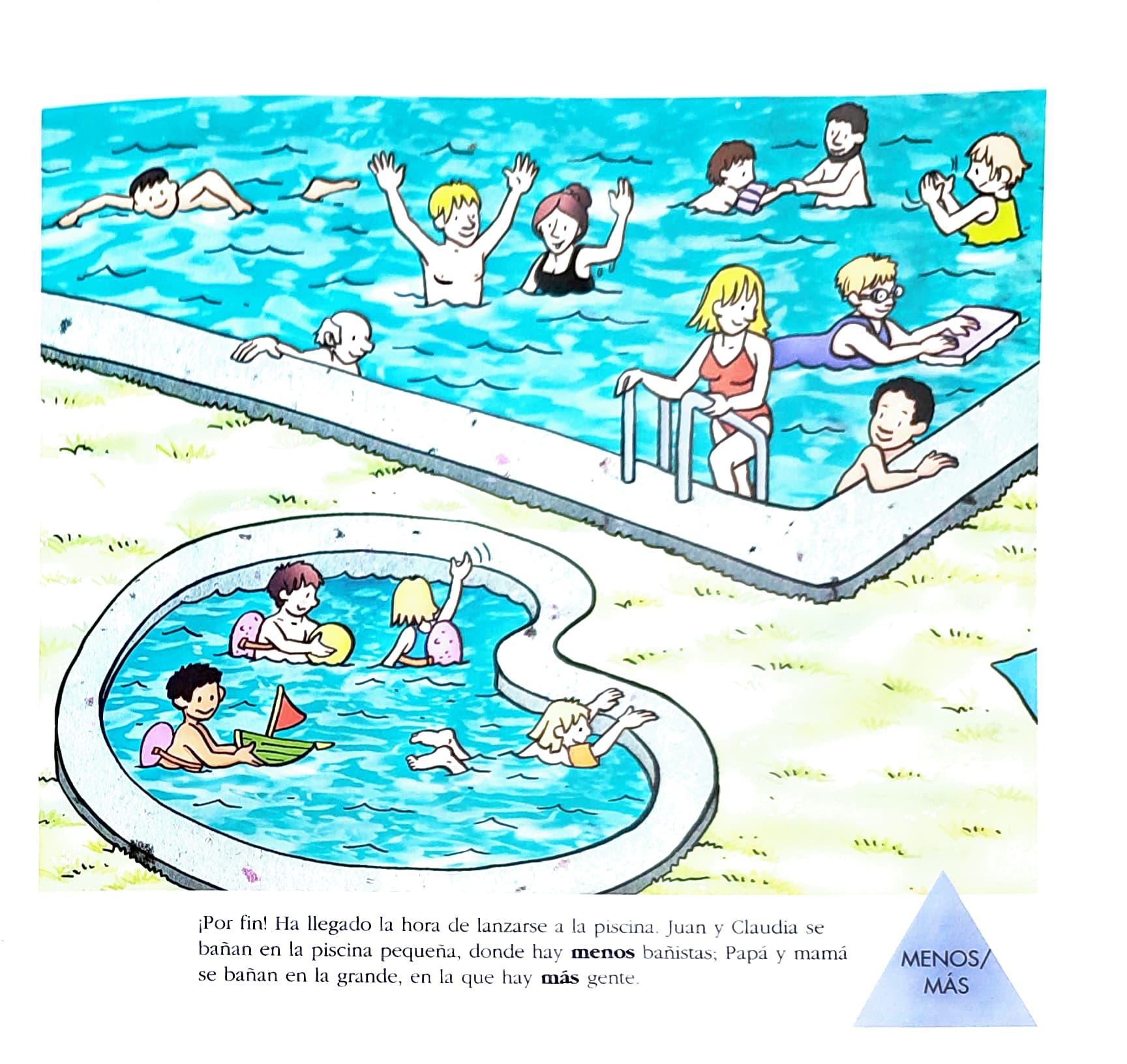 Por fin! Ha llegado la hora de lanzarse a la piscina. Juan y Claudia se bañan en la piscina pequeña, donde hay menos bañistas: Pap y mamá se bañan en la grande, en la que hay más gente