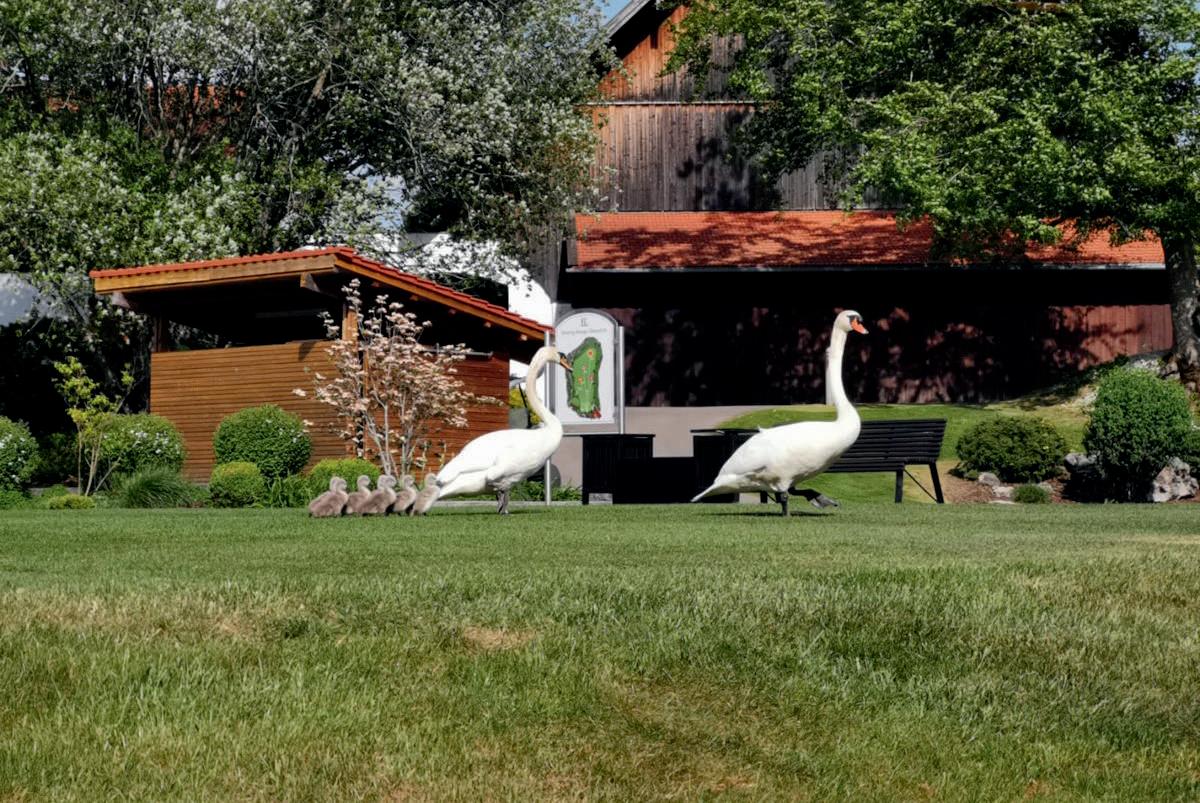 Abwechslungsreiche Platzcharakteristik mit idyllischen Ausblicken auf die Alpen, Waldsäume, Teiche und Blumenwiesen