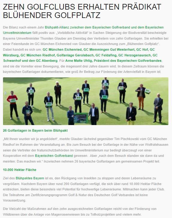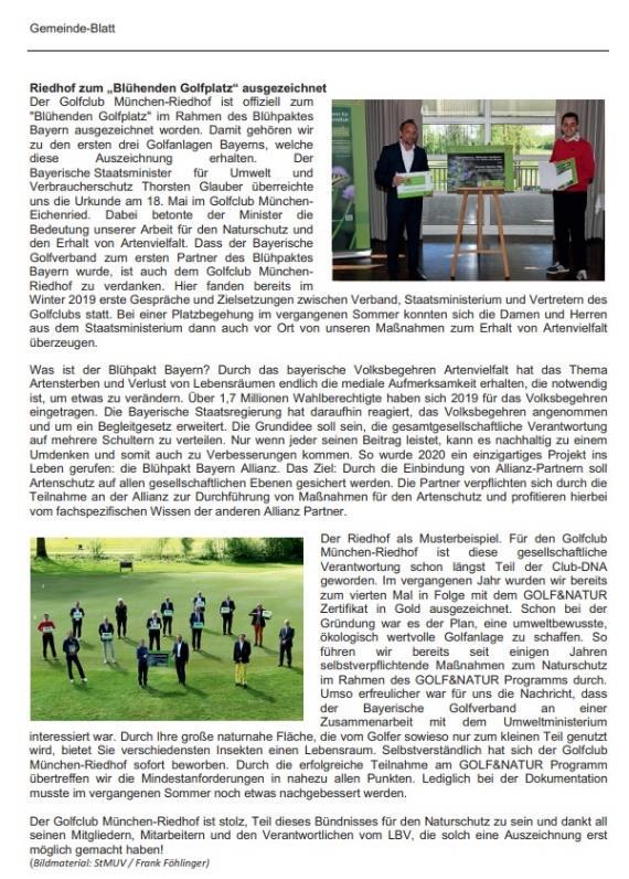 Der Golfclub München-Riedhof ist offiziell zum "Blühenden Golfplatz" im Rahmen des Blühpaktes Bayern ausgezeichnet worden. Damit gehören wir zu den ersten drei Golfanlagen Bayerns, welche diese Auszeichnung erhalten haben. Der Bayerische Staatsminister für Umwelt und Verbraucherschutz Thorsten Glauber überreichte uns die Urkunde am 18. Mai 2021 im Golfclub München-Eichenried.