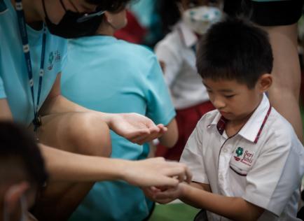After the video, the students were divided into two groups for activities: I (KS2) was paired with KS4 while KS1 was paired together with KS3 to make some Gigantic Raya cards! For our activity, we got to make chocolate breadsticks! We went to the canteen and were sorted into two groups. I got chosen for the “dipping” group while others were chosen for the decorating team! Everything smelled so good! In order to make the chocolate breadsticks, we had to take breadsticks and dip them in chocolate and then decorate them!
