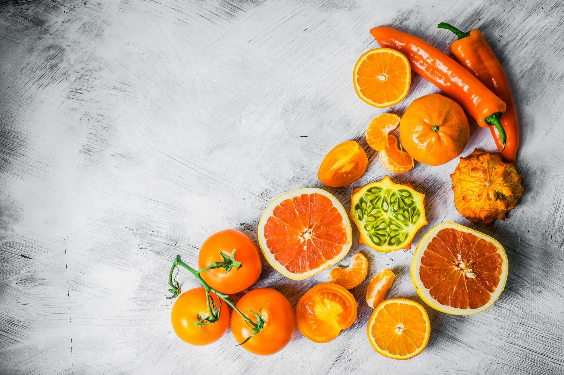 3. Arrange tomatoes, orange and yellow bell peppers, and asparagus on plate in rows above green pepper resembling a rainbow; arrange carrot coins on plate below rainbow.