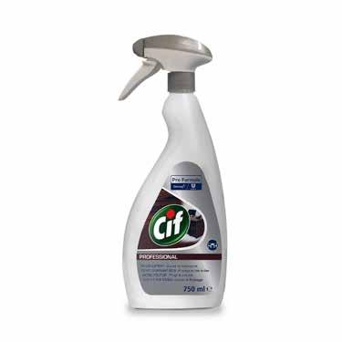 Cif Pro Formula Stainless Steel is a powerful and efficient cleaner for stainless steel surfaces. Due to its perfume-free formula, the product is safe to use in food preparation environments. It quickly removes dirt, grease and fingerprints in seconds and leaves a shiny result without streaks on stainless steel and glass. Rinsing is not necessary with Cif Pro Formula Stainless Steel and it is safe on aluminium. Cif Pro Formula Stainless Steel sense in a handy spray bottle with a capacity of 750ml.