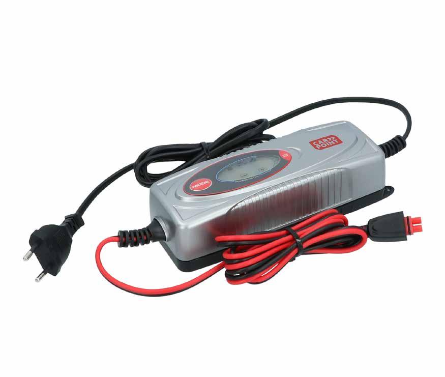 This Carpoint BX-1D battery charger is suitable for charging 12-volt with 1.2 to 120 amp rechargeable lead-acid batteries and 10-80 amp lithium batteries. The battery charger goes through a fully automatic charging cycle in 7 steps. Maximum charging current 3.8 amps. The battery charger comes with two different colour coded cables. One cable equipped with battery terminals for charging disconnected batteries and one cable with eye terminals (Ø6.3mm) and 10 amp fuse for permanently connected batteries . Both cables are equipped with a quick connector. Clear display with: mode key to switch between normal battery, small battery, Lithium or Calcium mode, Check indicator lights for error messages and reverse polarity. Charge indicator lights for fully charged or ready to use.