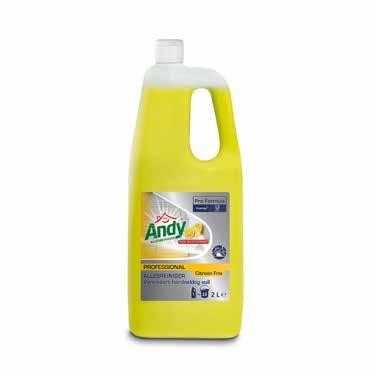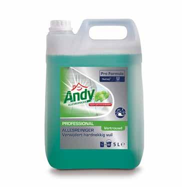 Andy Pro Formula Allesreiniger Vertrouwd is een milde, dagelijkse reiniger die vloeren en interieur stralend schoon en fris maken, zonder naspoelen. De professionele vertrouwde, krachtige formule neemt vuil en vet snel op en laat geen strepen achter. Allesreiniger Vertrouwd kan zowel onverdund voor hardnekkige verontreiniging als verdund voor dagelijkse reiniging worden gebruikt. Andy Pro Formula Allesreiniger Vertrouwd is geschikt voor vloeren, aanrechten, badkamers en keukens zit in een flacon met een inhoud van 2L.