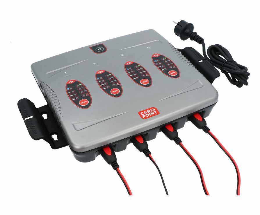 Deze Carpoint BX-6 acculader is geschikt voor het gelijktijdig opladen van maximaal vier 12 Volt 1,2-120Ah oplaadbare loodzuur accu’s. De acculader doorloopt een volautomatische oplaadcyclus in 5 stappen. Maximale laadstroom 16A. De acculader wordt geleverd met vier kabelsets om accu’s op te laden, alle sets hebben twee verschillende kleur gecodeerde kabels uitgerust met accuklemmen. Alle kabels zijn voorzien van een snelkoppeling. Vier afzonderlijke displays voor elk te laden accu, elke display heeft een mode toets om te schakelen tussen verschillende verschillenden laadwijze en controle LED indicatie lampen voor onjuiste polariteit en vier LED lampen die het laadpercentage aangeven (25/50/75 of 100% vol).
